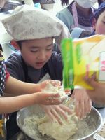 英語サークルで、ピザ作りをしました先生は、「ピザは簡単よ~」と言いますが、子供たちが手を出した途端、時間がかかります順番に並び、やっと生地をこねる事ができたKoo無事、おいしいピザを作ることができました