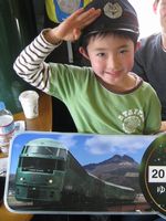 九州3日目。Kooが楽しみにしていた、「ゆふいんの森」に乗車です一番前の席が取れたので、テンションMAX見てください、この張り切った顔「レンタカー借りたのに、途中で返して電車に乗り換えるの」と思ってしまう私でも、Kooとパパを見ていたら、まぁいっか