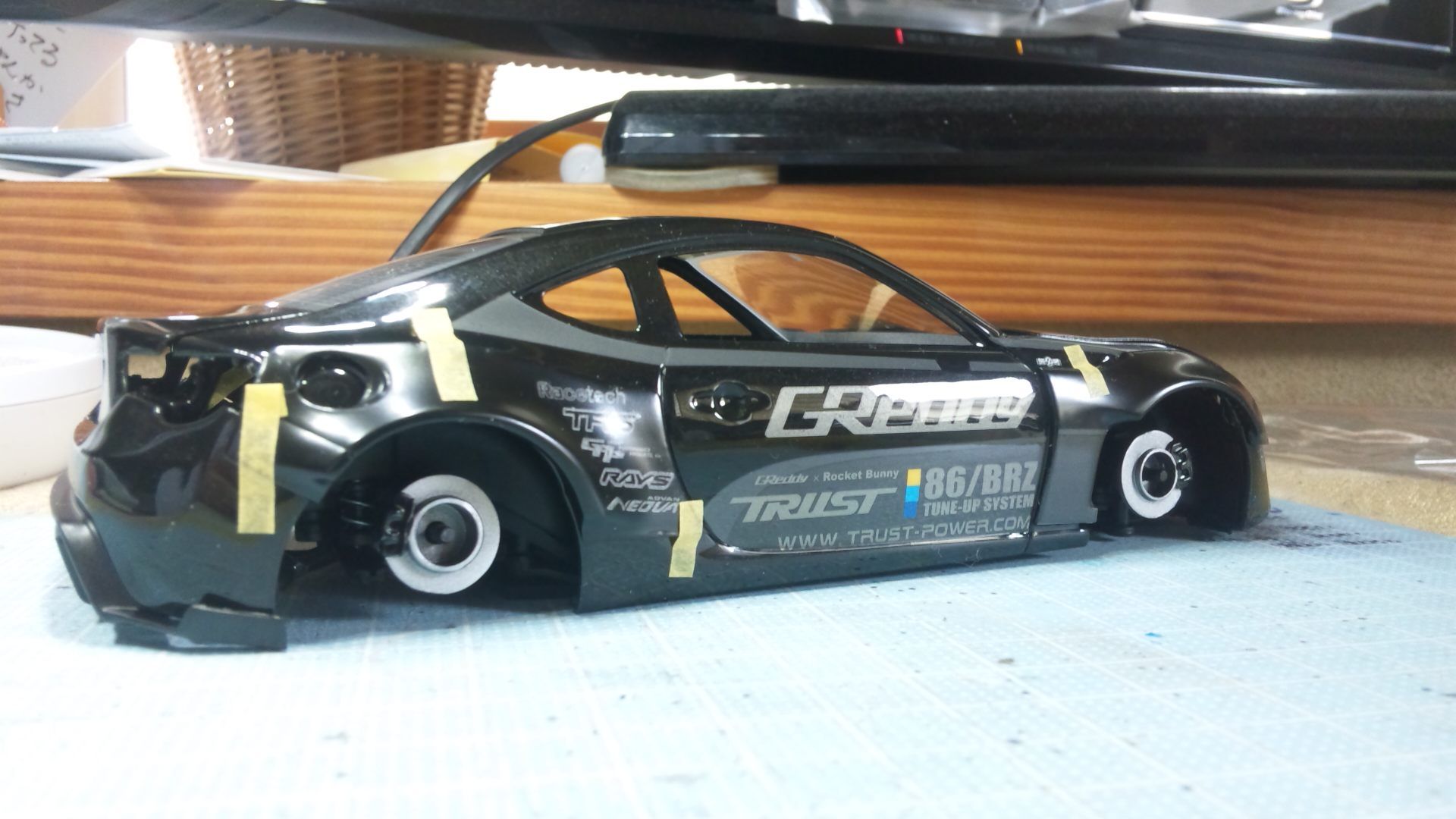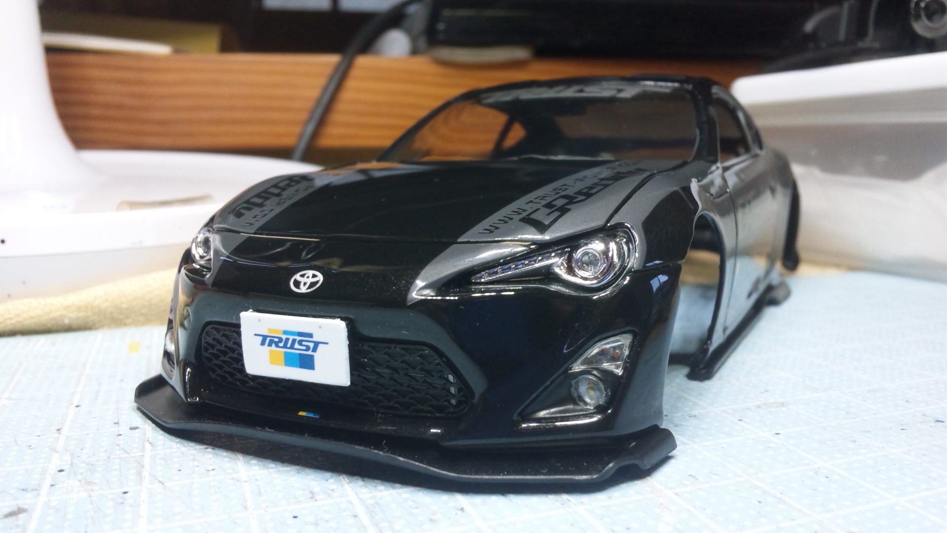 TOYOTA 86 '12 GReddy & Rocket Bunny アオシマ文化教材社 スケール 1/24 終了日:2017.5.24 <寸評> 3月27日に切り出しを開始してから約2か月……一日30分の日もあれば4時間の作業をした日もあり、まちまちですが通算38日間なにがしかかまいながら終了としました。 シャシー裏とホイール&タイヤまでは汚したのですが、現在ボディーは汚していません。ボディー下部も汚すことありきで制作をしてきたので、「どうせ汚しで隠れちゃうものね~」と手抜きや欠陥個所もありますが、「汚さなくても良いのでは?」との師匠のお言葉を尊重して取りあえず未汚しの状態で組み、写真を撮りました。 今後汚すかどうかは検討しますが、結構しっかりとはまっているので、シャーシからボディーを引っこ抜くのが難しそうです。念の為にと、外側から付けている両サイドの窓は極小の両面テープで留めておきました。仮にこのままボディーを汚す場合でも、窓を外してしまえば手に持ちやすいですから。 砂吹きを除いてクリアーは合計7回もかけたのに、この両側の窓は良くぞ納まってくれました。極力避けるように噴きつけはしましたが、マスキングせずに済ませられたことは喜ばしいです。 若干 ハの字開きのタイヤは初挑戦でしたが、なんとか恰好はついたでしょうか……前後一体の平らな窓パーツは微妙に隙間があるもののどうにか押し込めました……疑わずに素直にやってしまえば良かったですね~ 指定よりも若干増やした車体色=メタルブラックの雰囲気がこの写真では分かりません。自然光の下で撮ればチャンと分かるかもです。 デカールは毎度のことながらダメです。過信と明らかに目が悪くなりました。お褒めをくださる方もいらっしゃるのですが、恥ずかしい限りです。 決して満足のできる仕上がりではありませんが、不慣れなアオシマで、今回も様々なことに気付かされました。今後に役立つことを考慮して自己評価79点としておきます。制作過程で応援やお知恵をくださった方々に感謝いたします。 <おまけ…写真について> ① ② 蛍光灯と電球、二種類の光源がある室内で撮っています。 ① は両方の電灯を点けて、② は蛍光灯を消して電球のみで撮ったものです。 ホワイトバランスを変えればいいのでしょうが、面倒なのでそんなことはしません。かえって味わいの異なる写真となるのが良いと思っています。個人的には②の表情が好きなのですが、今回はなるべく模型そのものの色に近い方として①の状態で撮ったローアングルの写真ばかりを載せました。 どちらもストロボは焚きませんので基本的に光量不足の状態ですが、古いコンパクトデジカメでも勝手にISO感度を上げてくれます。ISOが上がるとノイズというのか画質が落ちるのですが、これがまた便利なことに模型のアラを隠してくれます。逆にピカピカ感がなくなってしまう欠点もありますが、実物を実物らしく撮るには良く晴れた日の野外ということになるでしょう。 チャンスがあったらそのうちに屋外でも撮ってみて、別角度も含めて②で撮影したものと合わせてフリーページに載せてみましょう。
