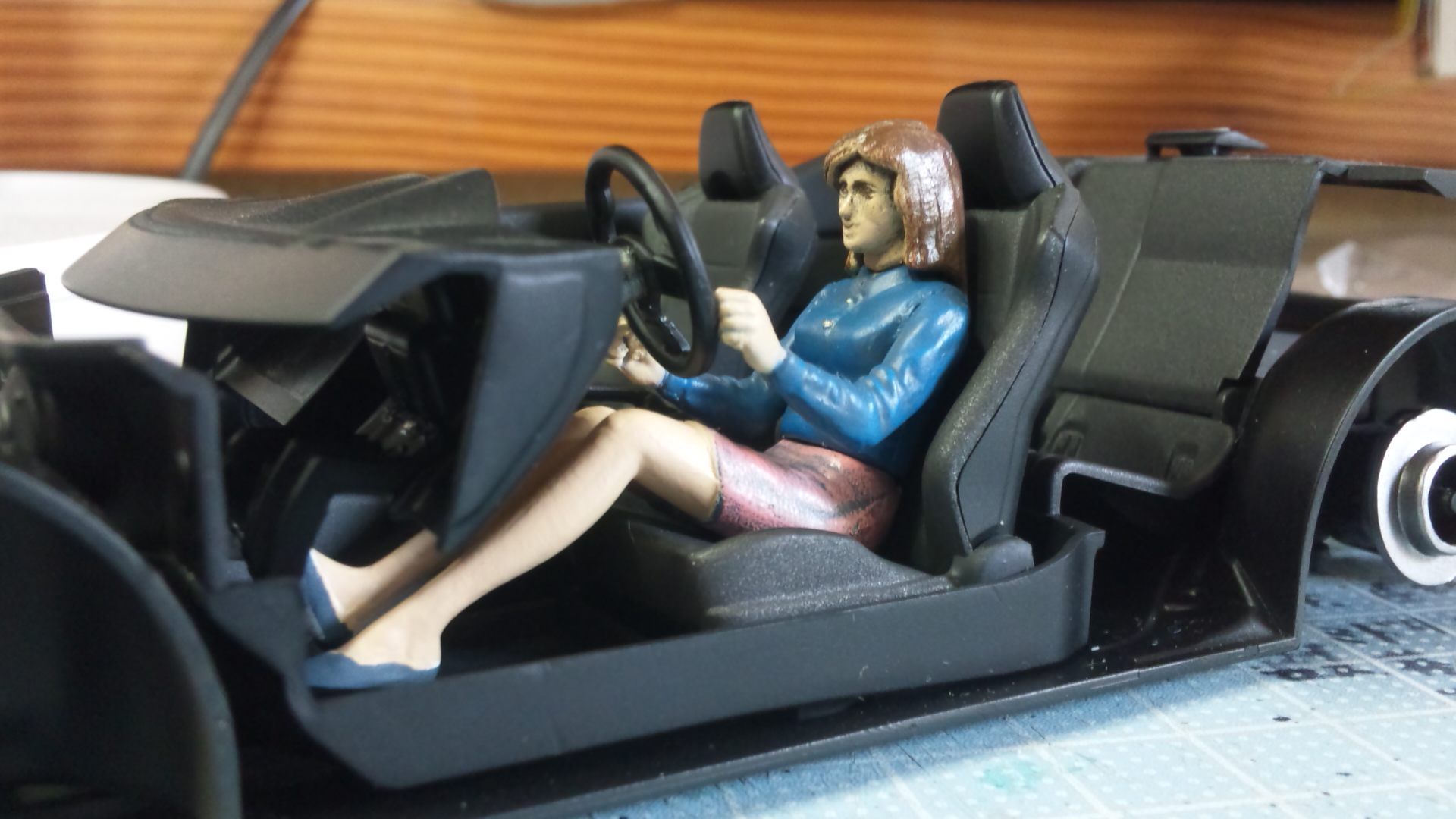 トヨタ 86 前回に続いてデカールを貼った本体のクリアーに取り掛かっています。 風の合間を見つけて、砂吹きから3日かけて4回のクリアーを吹きました。吹くたびに衣服のホコリを拾ってしまい、その都度サンドペーパーをあてながらの作業はシンドイです。ほぼ無風の日を待てば良いのですが、ずーっと風が続いているので我慢の限界です。何とか恰好が付いてきましたが、屋根はあと1回は塗ってやらないと…… デカールを貼った部分やパーツは、あと2回はクリアーが必要そうです。いつになったらサンドペーパーをかけられることやら… 忘れていたドアノブを切り出して一応下地を塗りました。直塗りでもいいかと思いましたが、性分です。切り取り部分はヤスリをあてたつもりですが、残ってしまっています。良しとしましょう。ボディーの調合色、多めに作り残しておいて正解でしたが、これだけのためにエアーブラシの掃除は面倒です。 シャーシ裏はパーツを付けました。本体を汚す時に一緒に汚してやります。 ここで悪魔が囁きました…「師匠を見習って人形乗せなさい」と… ドライブラシの練習用にと、昨年5月11日に雷王模型で買ってあった人形を引っ張り出してきました。室内はシャーシを汚してから最後に組む予定でしたが、仮組して置いてみることに……オネエチャンの脇が閉まり過ぎていてハンドル位置に合いません。パテかプラバンを貼って加工が必要ですが、果たして私の手におえるか??? 細いおみ足の両サイドにも金型のはみ出し部分が残っています。削るのも手間がかかりそうです。 と言う訳で、どうなるか分かりませんがボチボチ頑張ってみます。おっと、べダルの位置関係確認を見落としていました。駄目ですね~