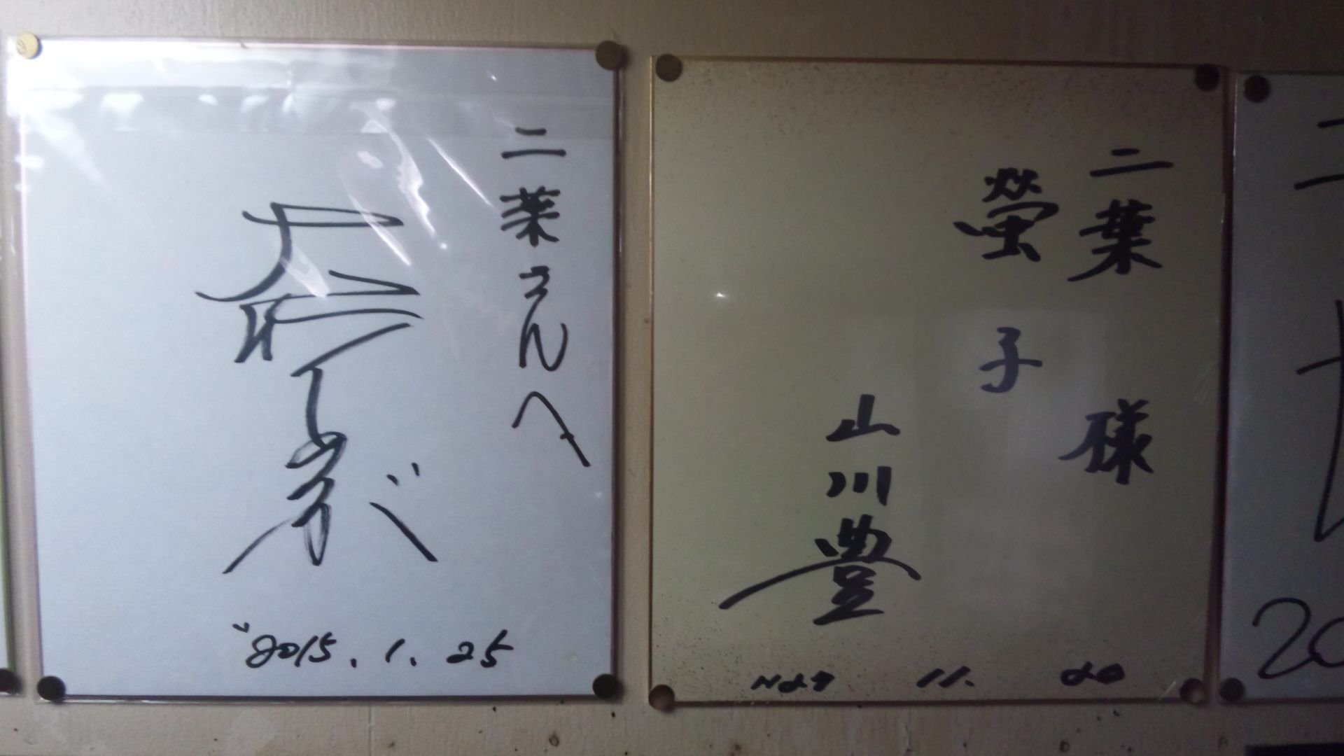 前回 二葉さんで松田龍平さんと松島菜々子さんの色紙を撮ってきました。 先日伺った時に、また撮ってきました。色紙の写真を集めるのが趣味ではありませんが…… 大竹しのぶさんはロケだったかしら? 山川豊さんは常連みたいです。 左は私には読めません… 氷川きよしさんも来てたのね~新曲キャンペーンかしら? 極楽は読めるから…とんぼかしら? 右の方はさっきと一緒やな~二度目か… 平井理央さん……これは読めます ちなみに、二葉さんは昨日から3連休(3日・4日・5日)です。食材の仕入れ先がお休みなんですって…… 高速道路の上りは今日からUターンラッシュが始まるそうです。お出かけの皆さん、事故のなきようお祈りいたします。