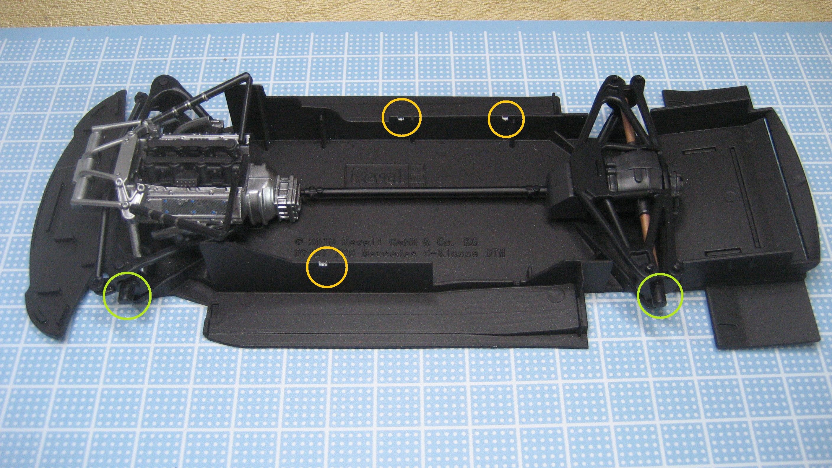Trilux AMG Mercedes C-klasse DTM 2009 前回に続きチマチマとやっています…… 90%のパーツは色を塗ったので、シャーシ関係を付けました。 黄色〇部分は白くなっていますが、室内を乗せてみたらキチキチだった為、接合個所をヤスリで少しだけ削りました。素組みをした時も「結構、合せがしっかりしてるな~」と感じていたのですが、塗膜の分だけハマリが悪くなったようです。塗装は薄めにしたはずなのに…… 同じ事情で緑色〇部分も塗装を剥がした方がよさそうです。ホイールを収めるのにきつそうです。こんな所まで素組みしてなかった私が悪いのですが、知ってたらマスキングしっちゃったのに……いつも手間ばかりかかっています。 室内もパーツを取り付けました。定番ですが、プロペラシャフトもどきは見えなくなってしまいます。 キャリパーのデカールも貼ってやりました。省略しようとも思ったのですが、やっぱり性分ですね~ 筆塗り部分は適当です……真剣にやり過ぎると目に悪いですし、眼圧が高いので来週の検査にひっかからないよう用心しています。 ボディー系パーツのデカール貼りも一応終了しました。毎度のことながら一発勝負は辛いです……とりあえず「それらしく」ってことで良しとしましょう。 ドアノブ、サイドミラーや窓のクリアーパーツの切り出し・塗装などもまだまだです。来週は年金事務所も行かなくちゃならないし、歯医者や人間ドックも控えているし、気の向くままボチボチやっていきます。『九州や島根など、大雨で被害を受けていらっしゃるみなさまのご無事と早期復興を、心よりお祈り申し上げます。』