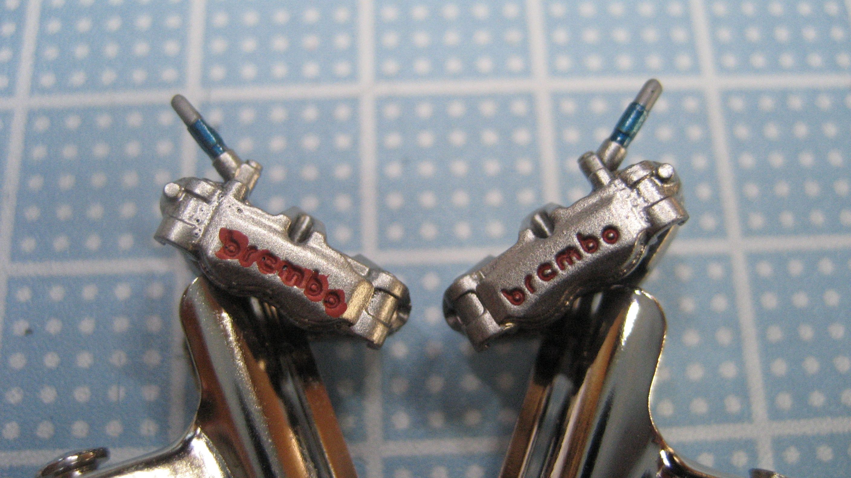 模型作りの超初心者さんに、便利グッズを紹介します。 年寄りからのクリスマス・プレゼントであります。 バイクのブレーキキャリパーです。デカールも充分貼れるのですが、今回は墨入れにしました。左のようにロゴにエナメル塗料をペタペタします。乾いたら拭き取ると右のようになります。(シルバーの下地はラッカー系塗料です。下地もエナメルの場合にはできません。) でもって、はみ出た塗料を拭き取るのに便利な[フィニッシュマスター]です。黒い棒に付けた白い消しゴムみたいなものが優秀です。 吸水性のある材質なので、エナメル溶剤を少し吸わせて(溶剤にちょっと漬けるだけ)はみ出た塗料を拭き取ってやりますが、先端が平面になっているので溝にある塗料は落としません。綿棒などでは平らに拭き取れないので、あると便利ですよ~ 車や飛行機の墨入れなどの他にも、吸水性を利用してデカールの圧着にも使っています。狭い場所など良いと思っています。 つまらない物の紹介でした……悪しからずです。