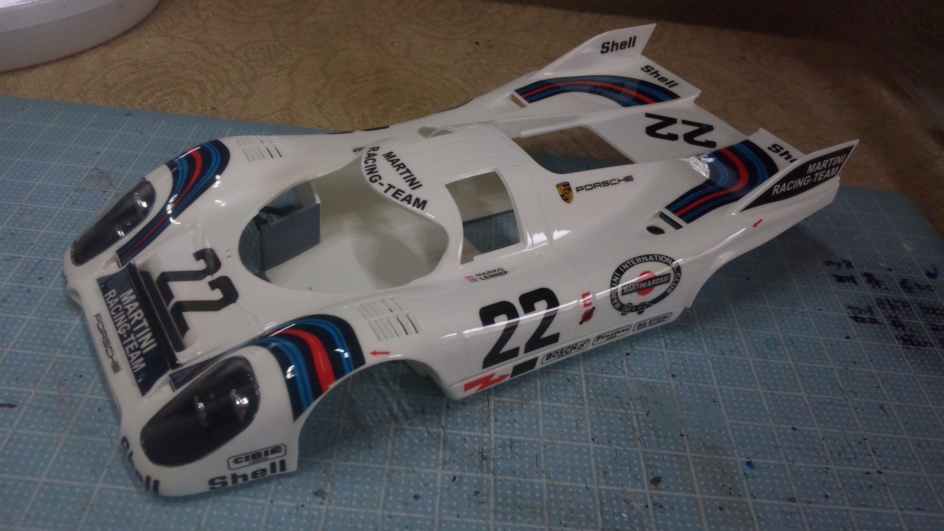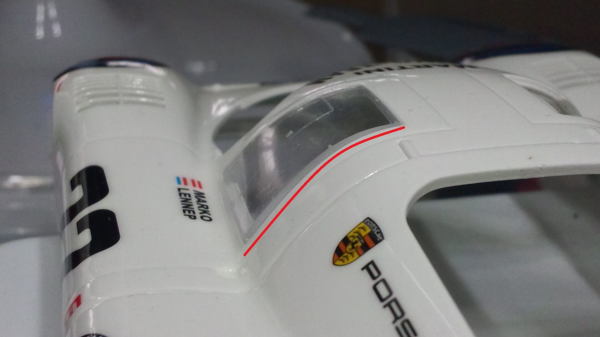 塗装前に削って、ある程度収まりを確認した窓ですが、色やクリアーの塗装の厚さで収まりません。予期していたことですが、赤い線の部分がはまるようにまた削ってやらなければなりません。タミヤさんはこんなこと無いのになぁ~ ……ヘッドライトカバーと同じように、先に付けてからクリアーかけても良かったかしら?
