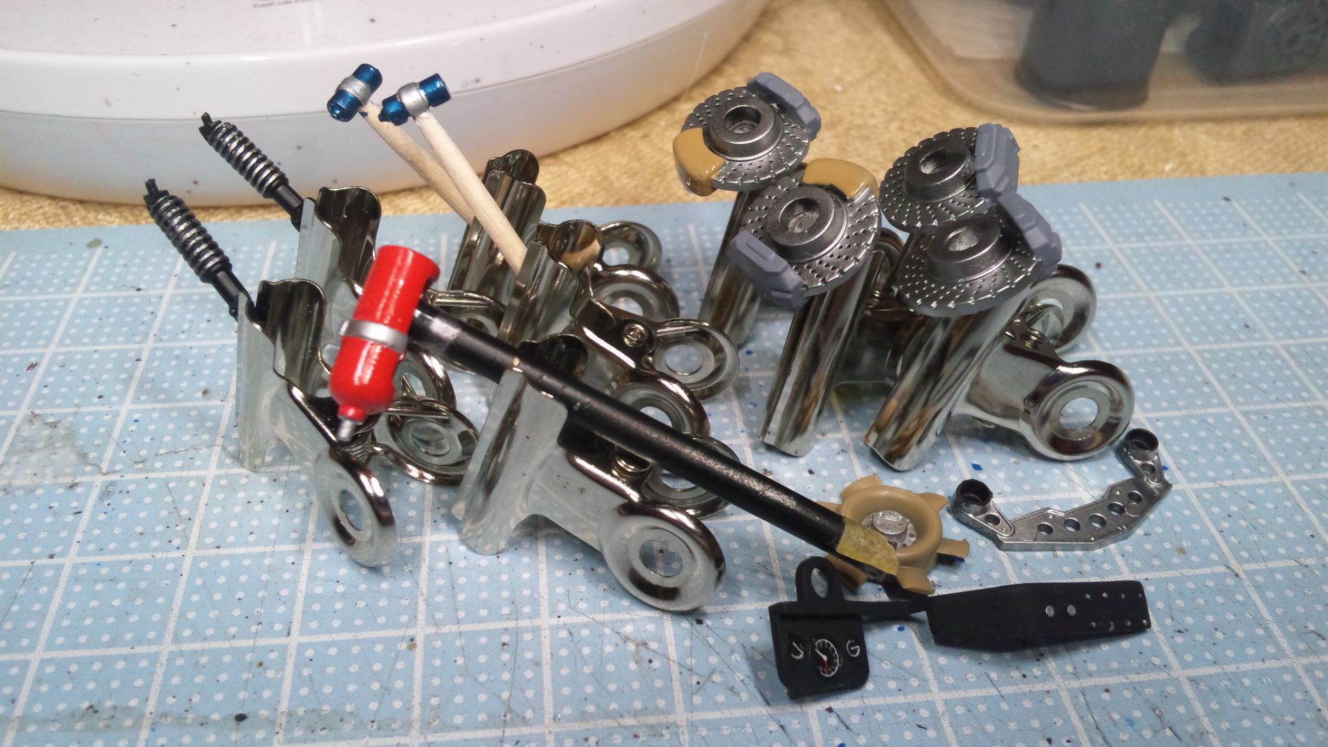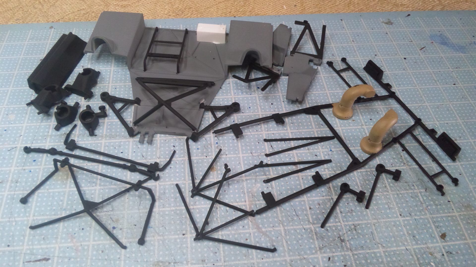 一応主要パーツの塗装は済みました。エンジン下部等ある程度組んでからシャーシ下側の汚しをする予定です。その後、ボディーを仮り乗せして両サイドを汚し、最後に全パーツを取り付けてから最終全体汚しの段取りです。