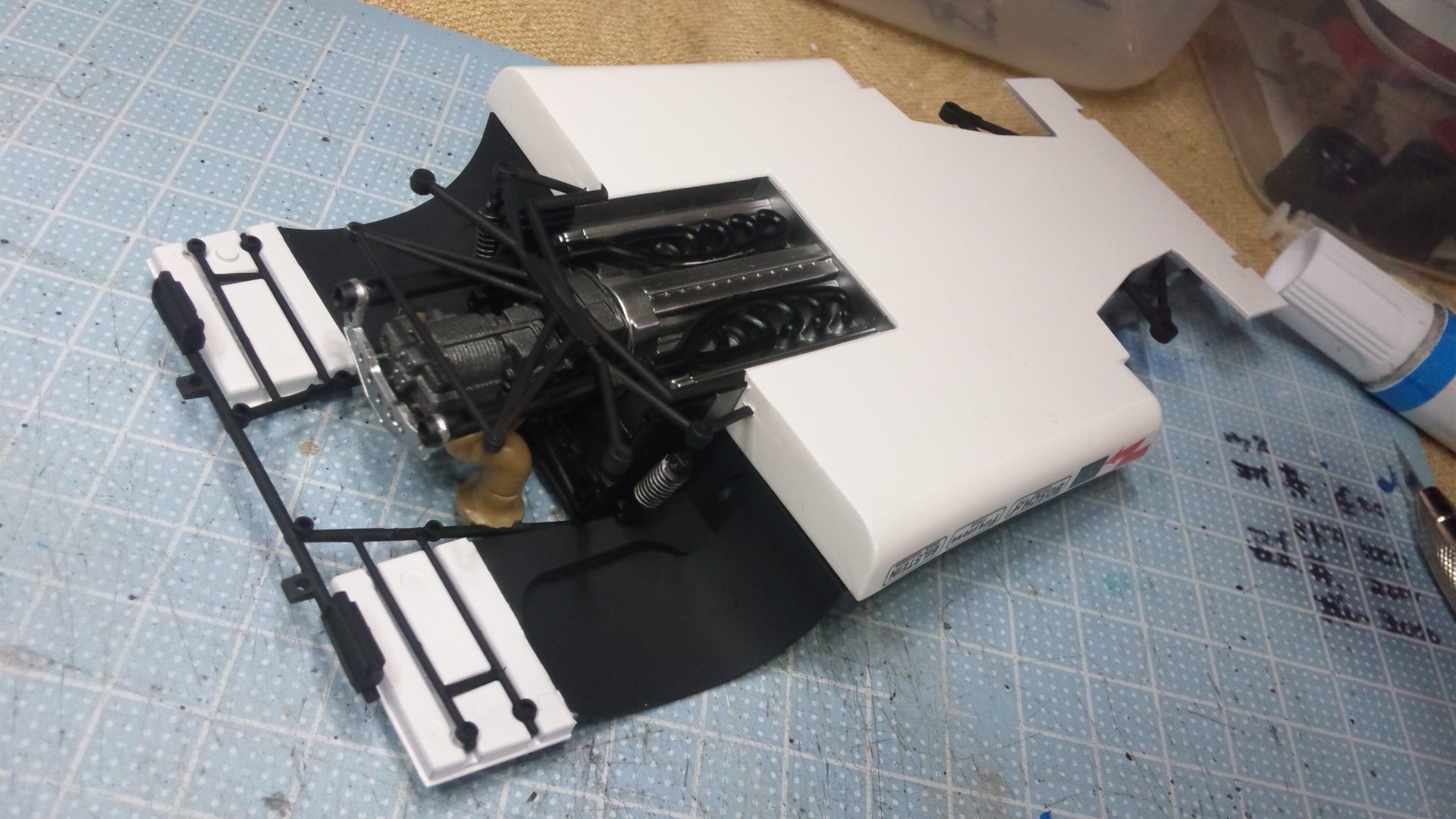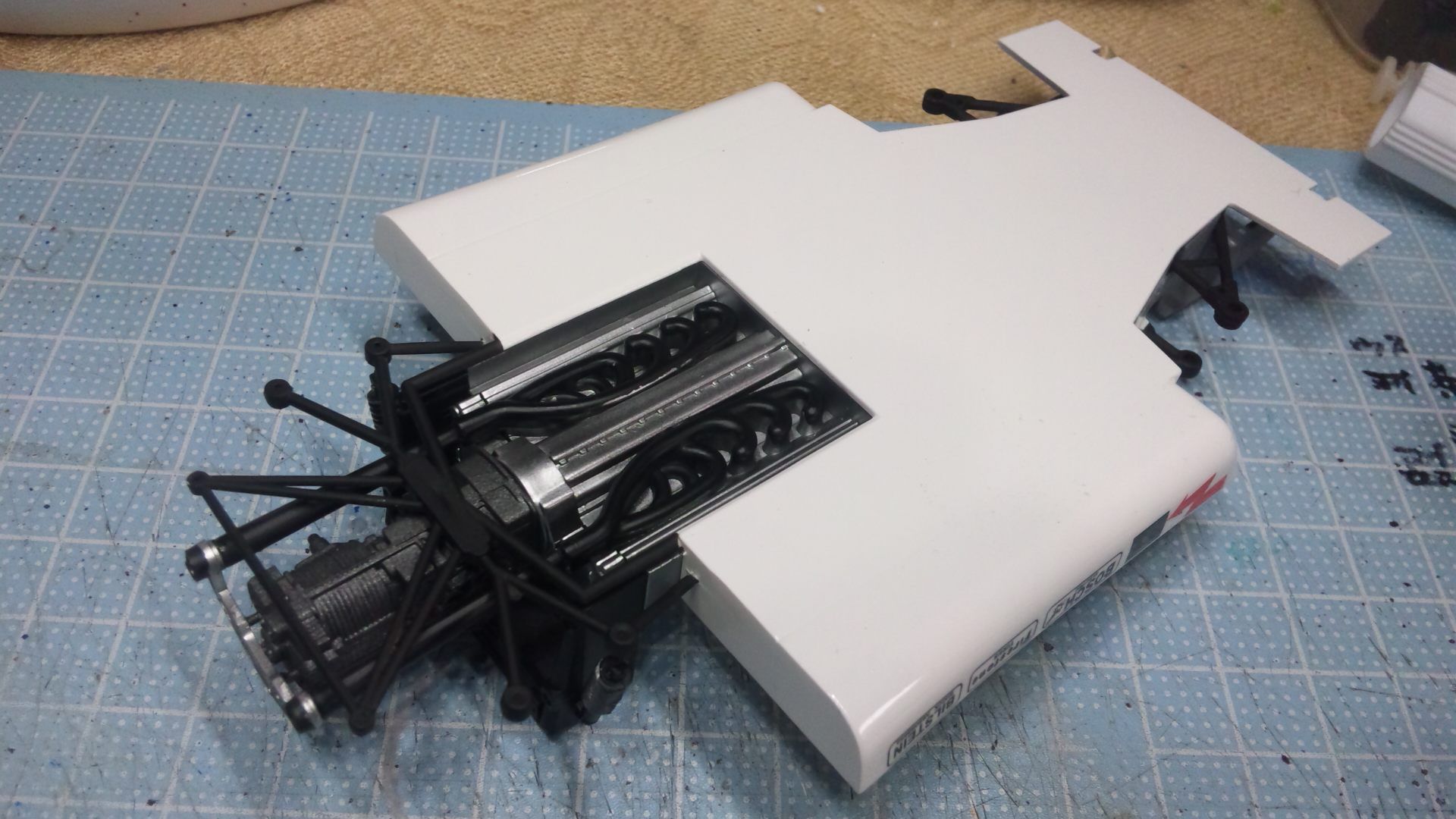 ここでチョット仮組、ボディーとのはまり具合を確認……シャーシ先端が今一合わないので削って修正してやりました。 本作は、全く仮組をせずに作っているので不安があります。