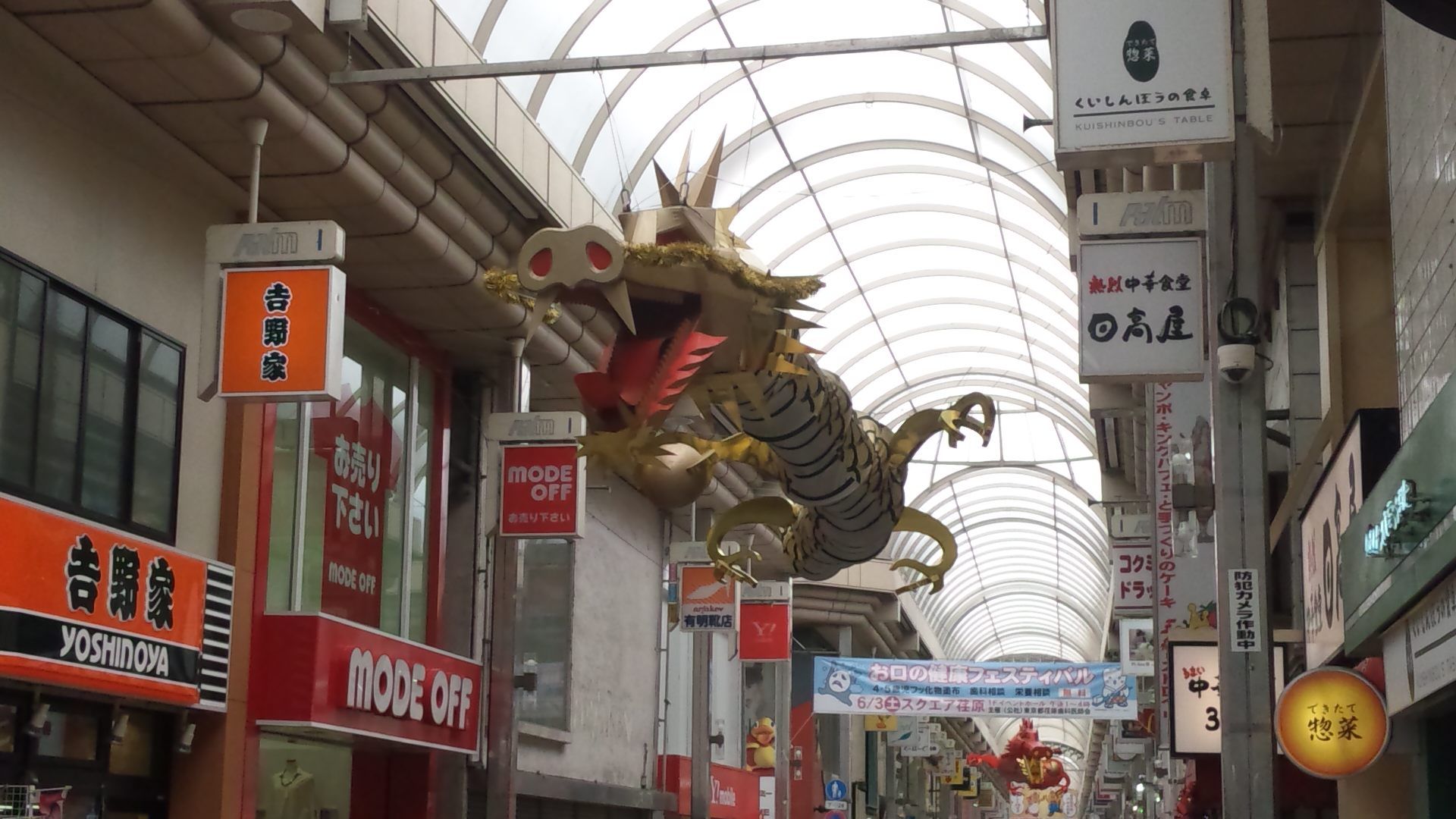 天ぷら定食屋とかパン屋の新店が目に留まりましたが、どこにも寄りません。せっかく来たので、鯉のぼりならぬ龍のぼりを撮ってきました。何かのイベントがあるのかしら???