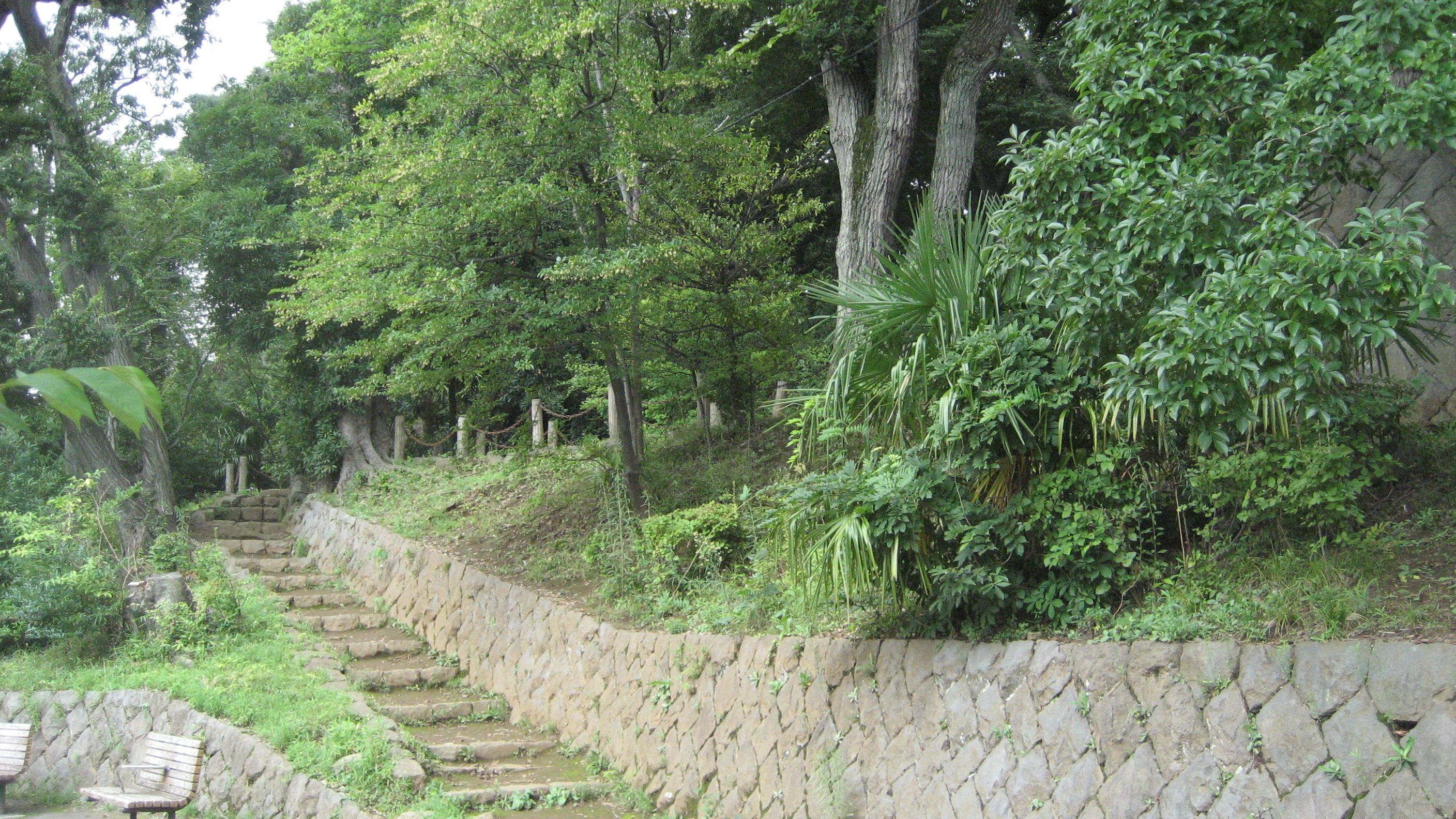 「なんで~ 石が積んであるじゃない?」と思いきや、公園にするのに崩落防止で石垣で囲んだようです。