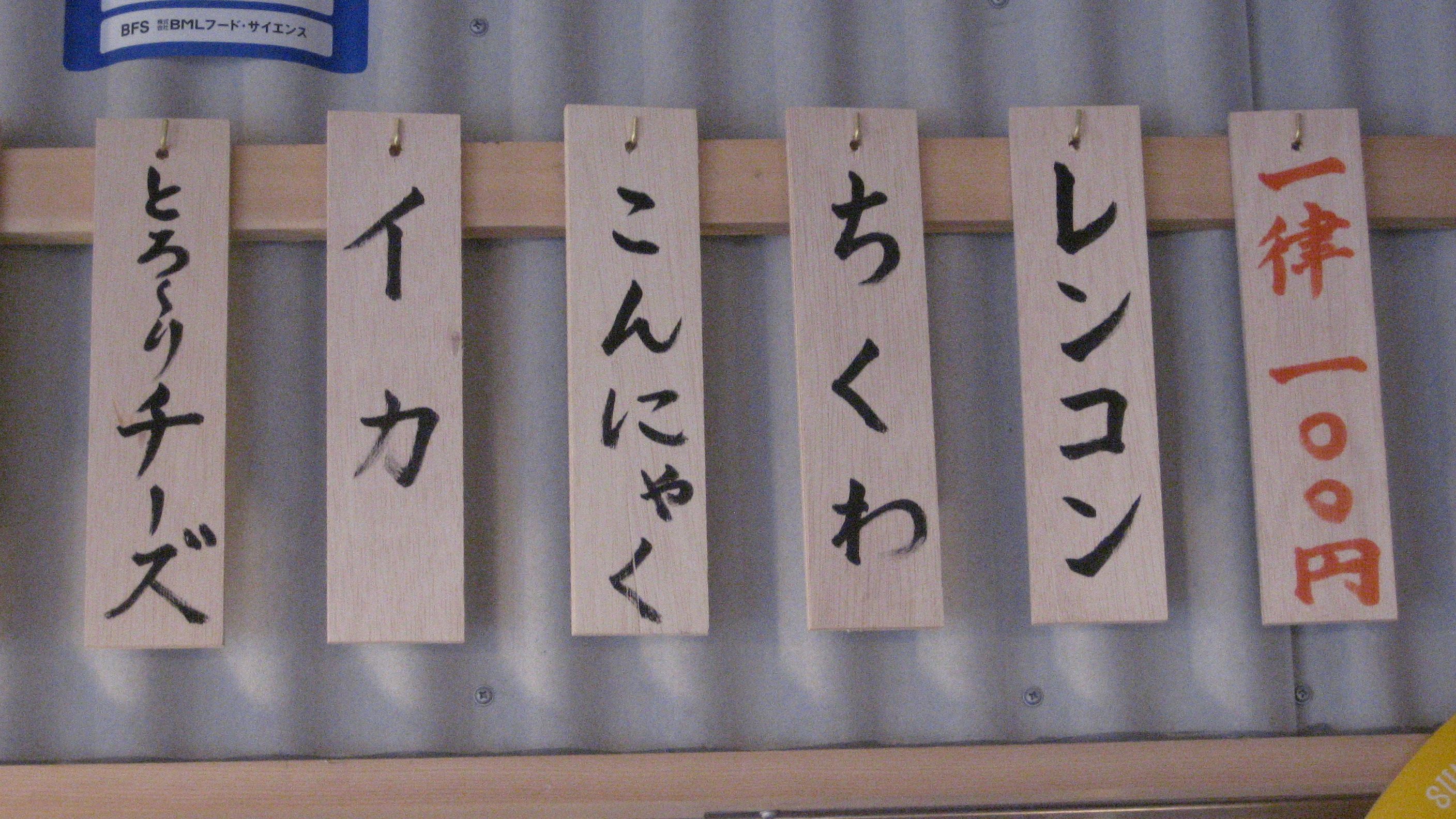 (左から)イカ・アサリ・牛カツ・ウズラ……イカは(撮影前に)一口かじってしまいましたが、隠し包丁というか切り込みがしてありました。100円なので2個かと思いきや鶉卵も3個刺さっていました。