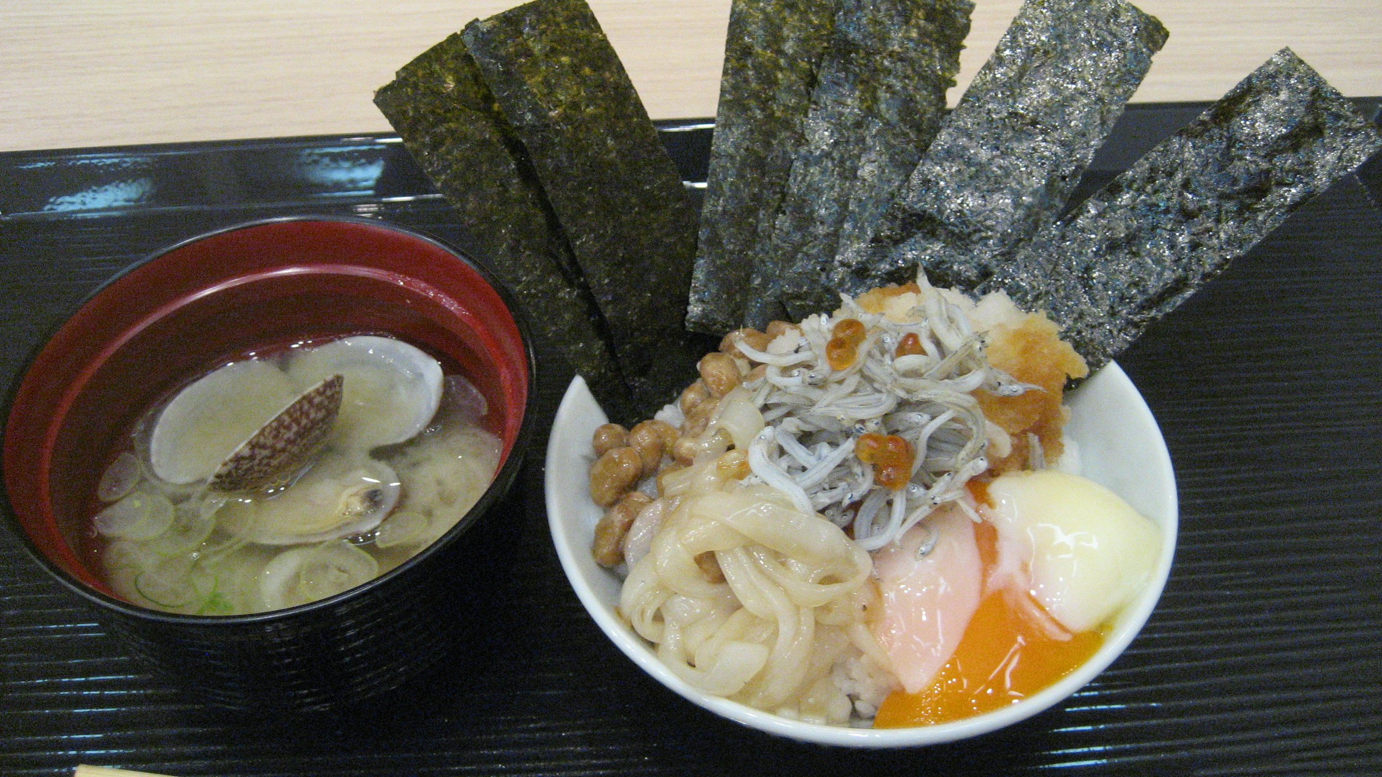 完成~ ごちゃごちゃ丼であります。(丼ぶりではないですね~) 味噌汁には具がなかったので、アサリを入れてやったのでありました。