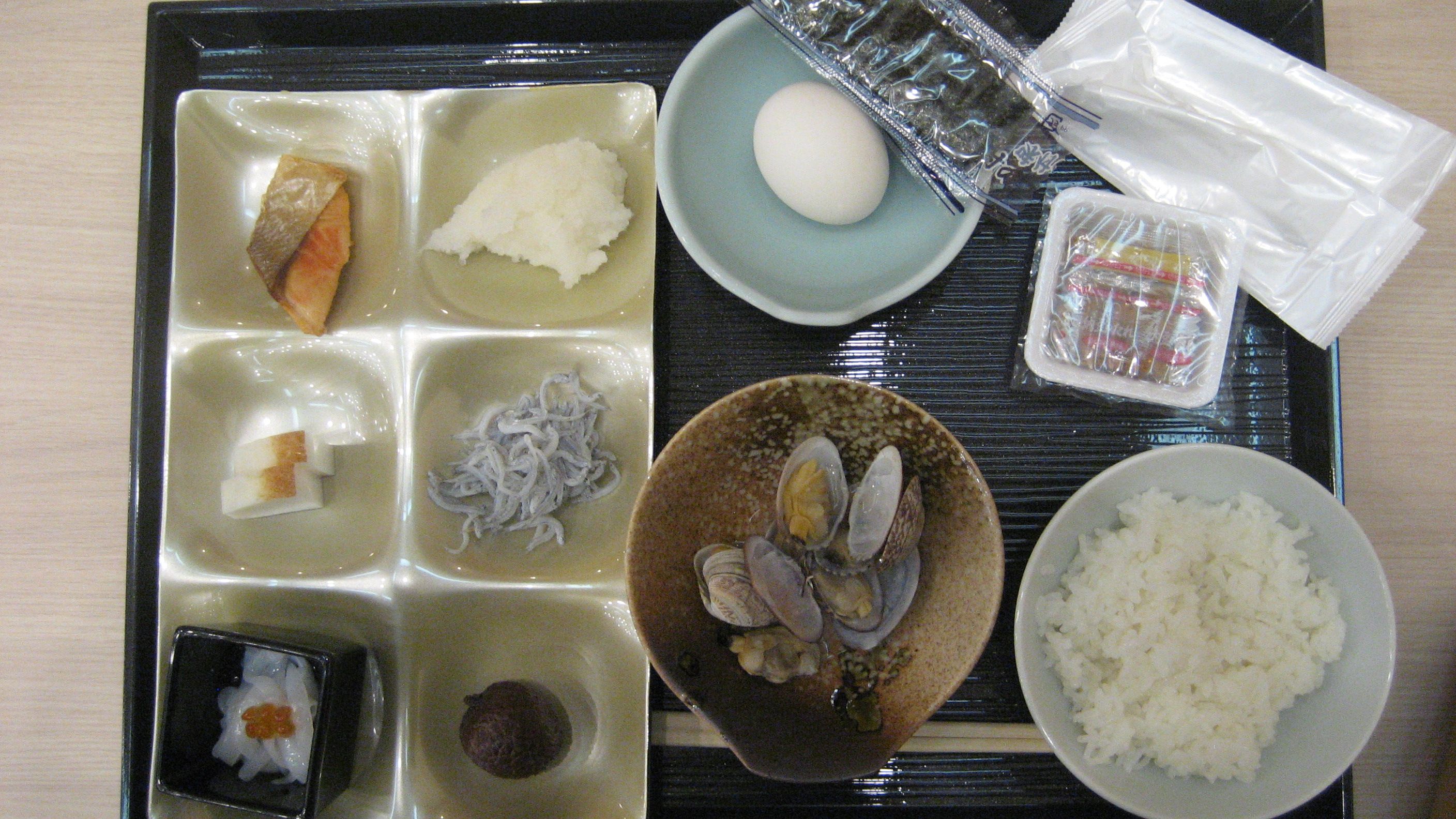 でもって、食欲はあまりなかったのですが朝食バイキング……胃に重そうな料理がたくさんたくさん並んでいましたが、私はこれだけ。鮭、大根おろし、蒲鉾、シラス、イカ刺し、焼き海苔、温泉卵に納豆、アサリ酒蒸しとなぜかライチを1粒。