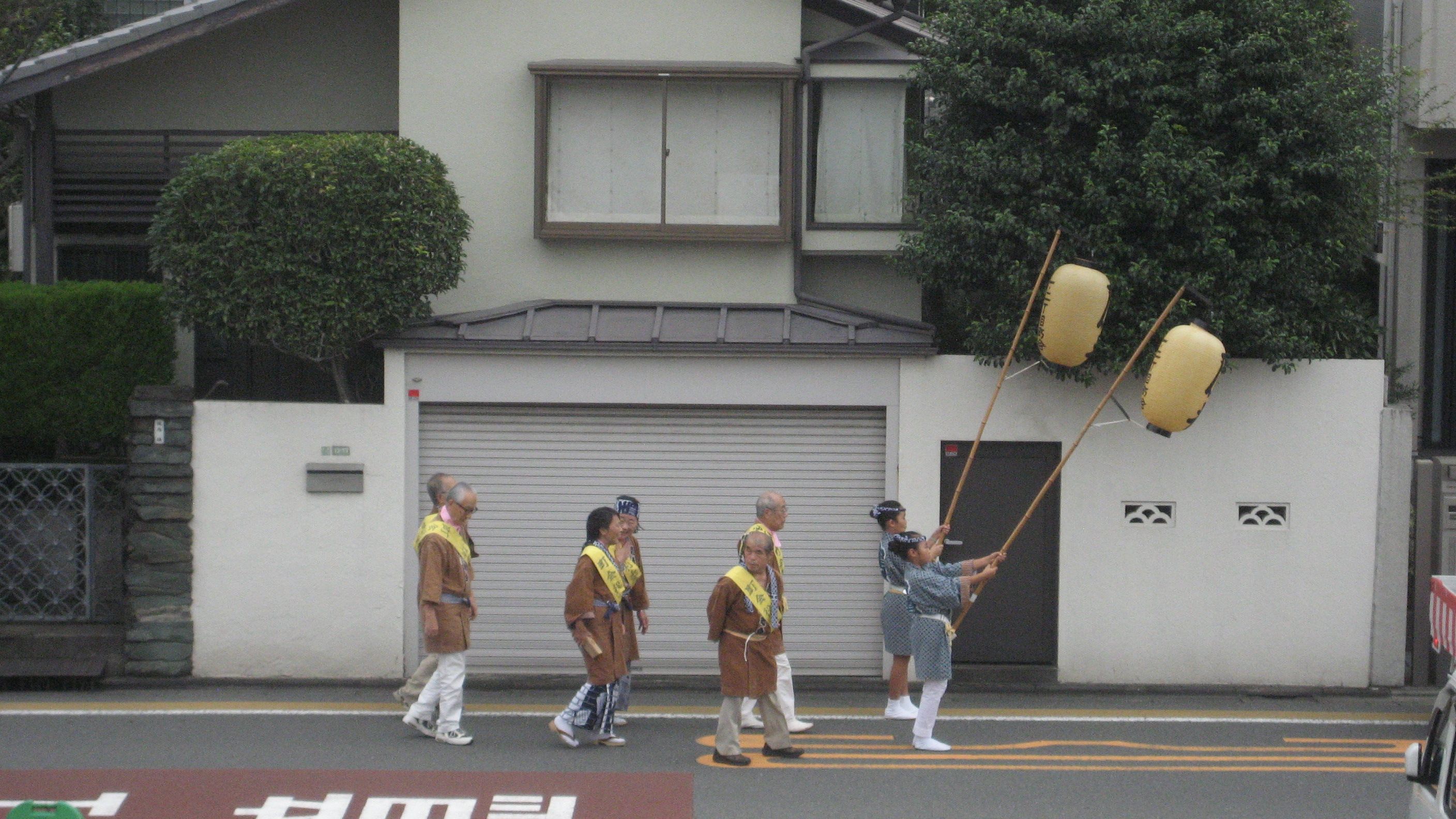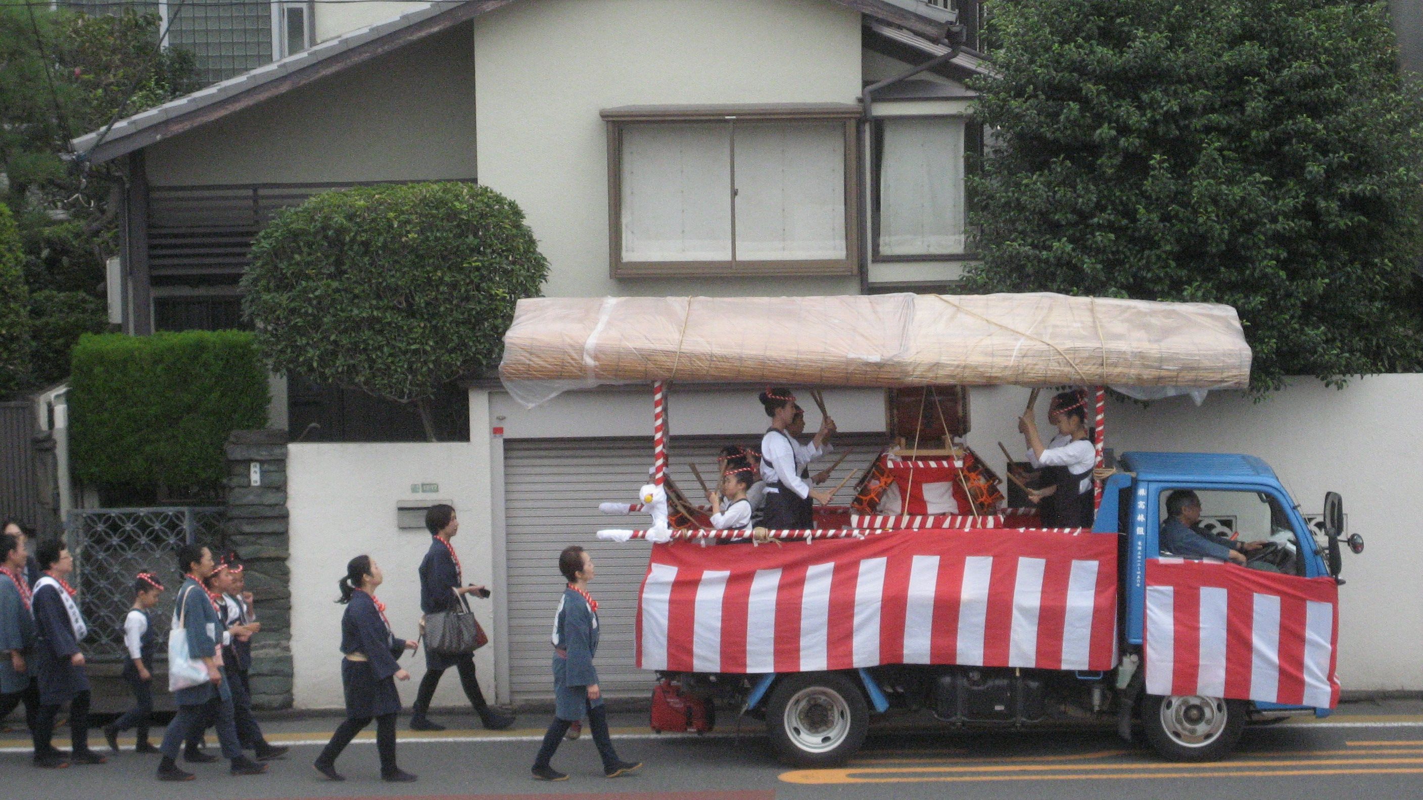 この日記を書いていたら太鼓の音が聞こえてきたので見てみたら……太鼓を乗せたトラックに続いてぞろぞろ歩いておいでです。どうも女性ばかりですが、女性版山車みたいなものかしら……初めて目にしました。