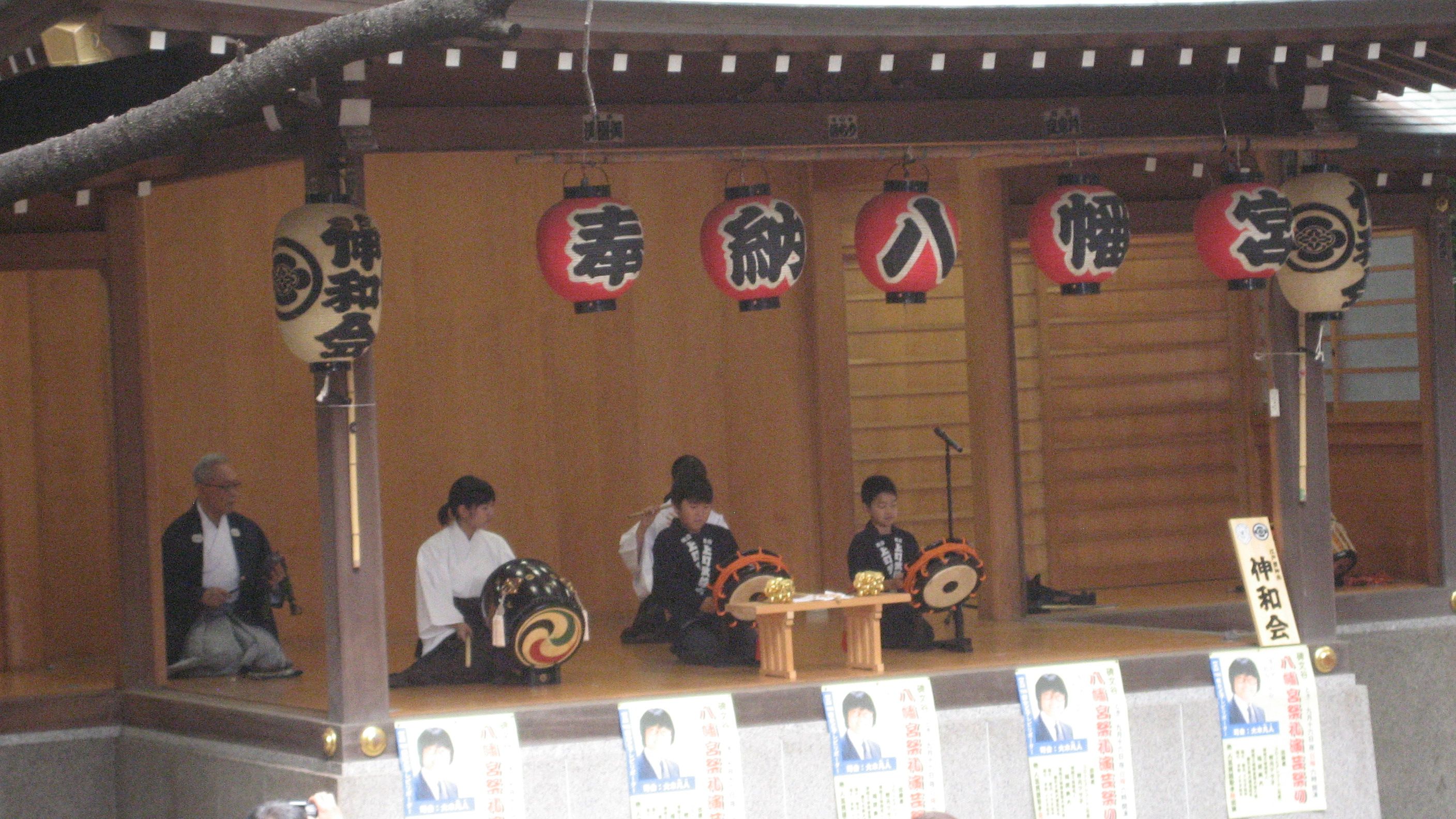 お詣りをすませると聞こえてきたので振り返ると、子どもたちが笛・太鼓を奏でていました。予行演習なのかしら?