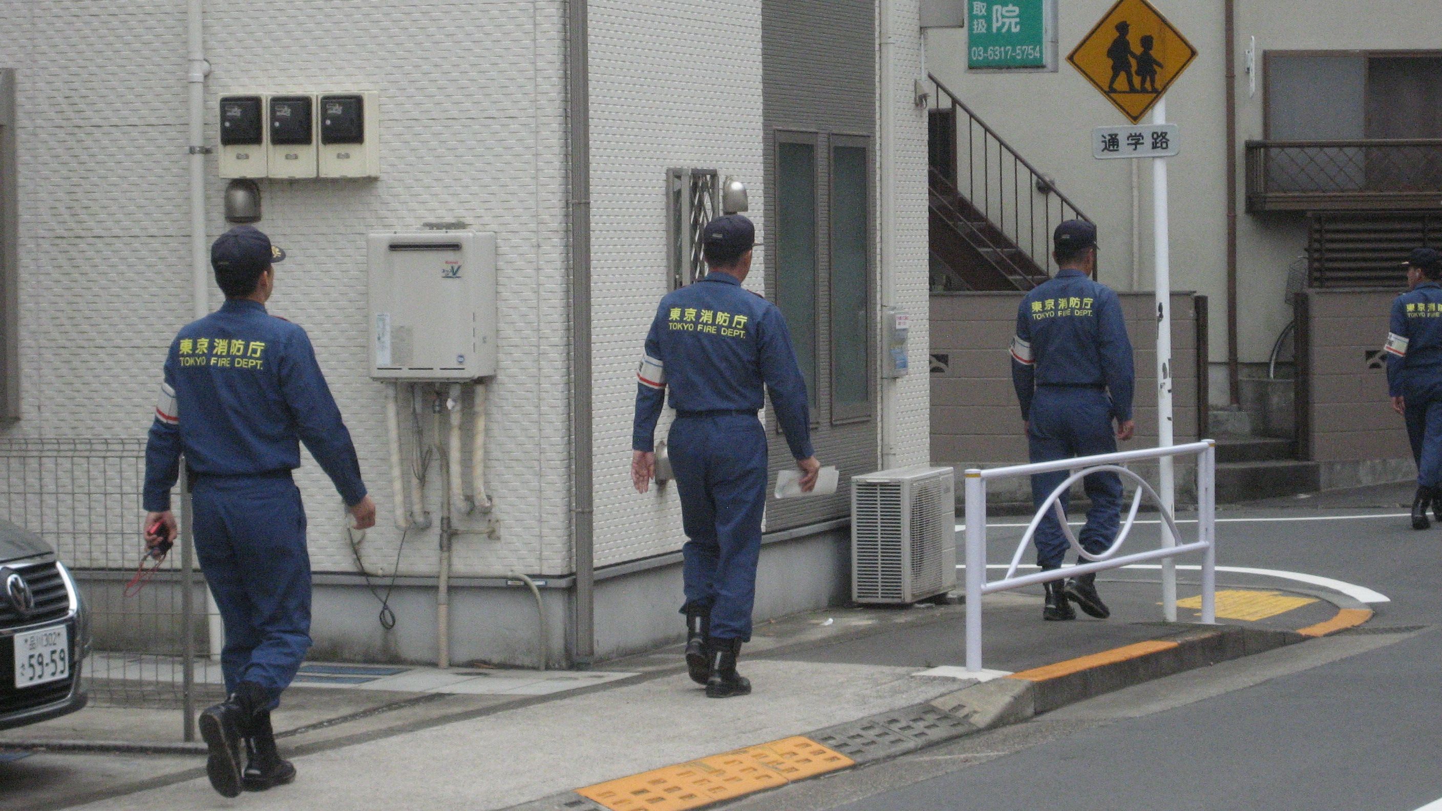 東京消防庁の方々ご出勤……警備をされるのでしょうか? 屋台の火の扱いの点検・確認でしょうか? ご苦労様です。