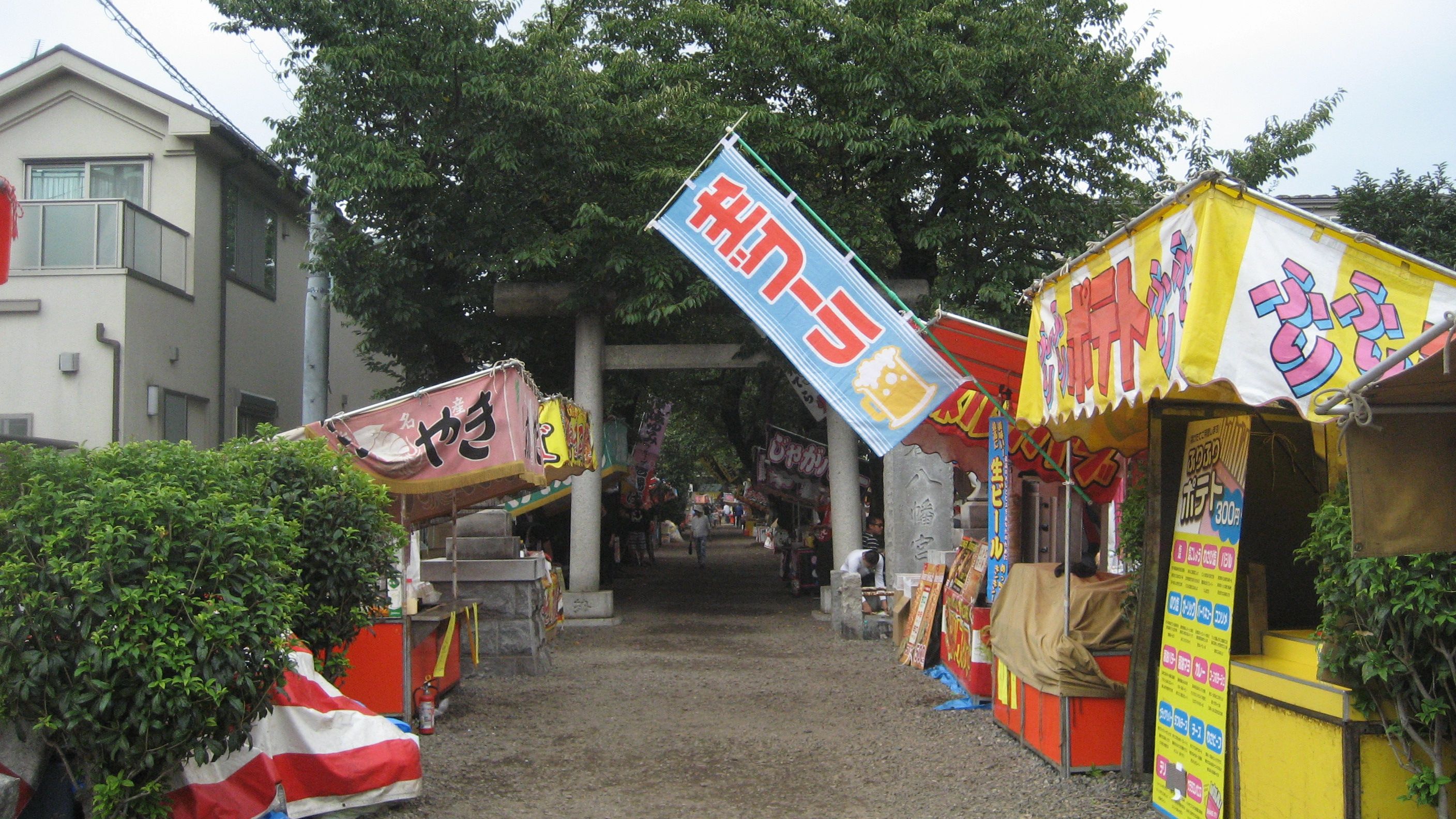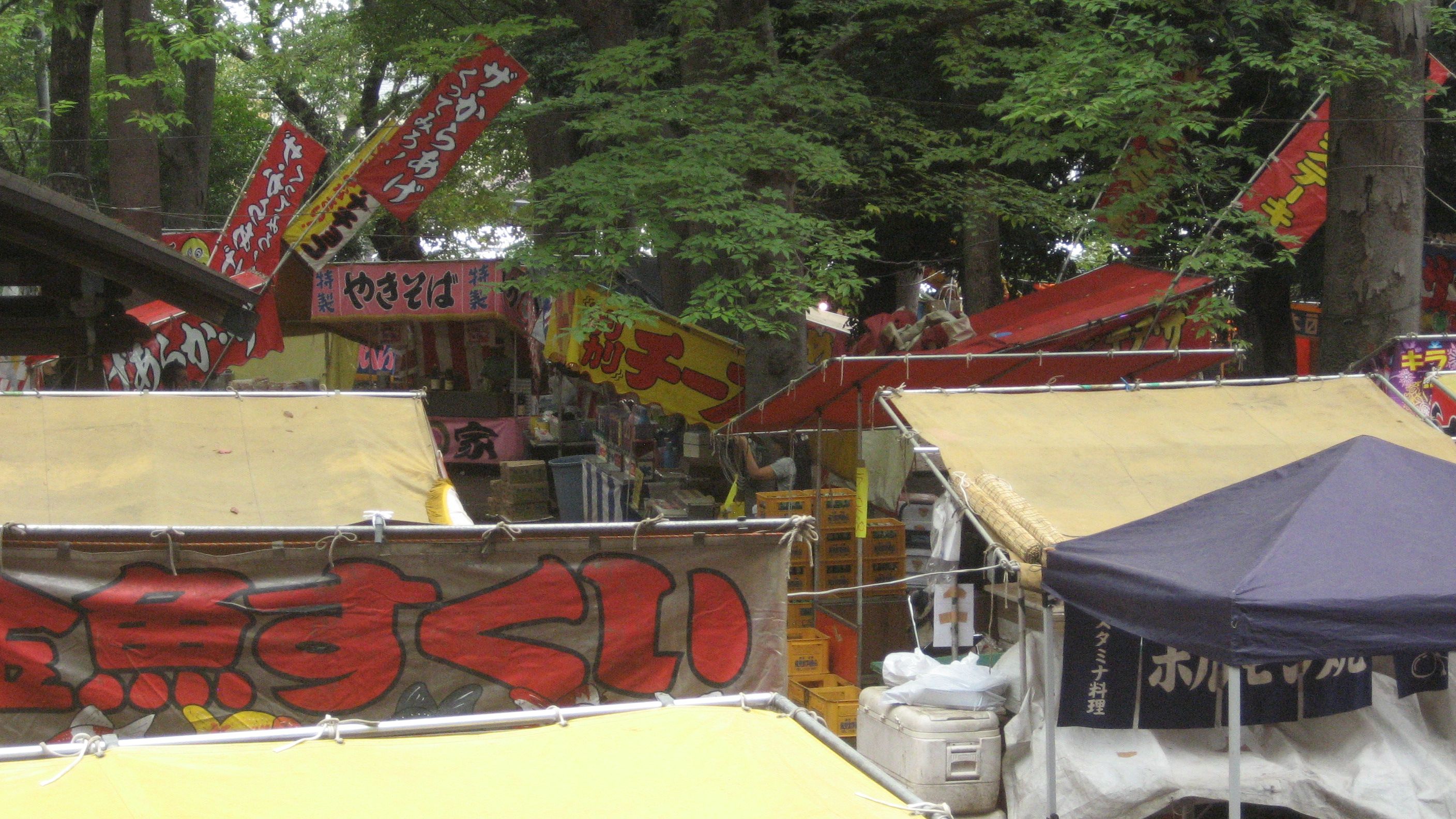神楽殿の向かい側には屋台のテント群……ほとんどが準備中でした。10時は過ぎていたのにスロースタートです。生ビールの置かれた店も営業前風情だったので、今年は貢献せずにスルーした私です。