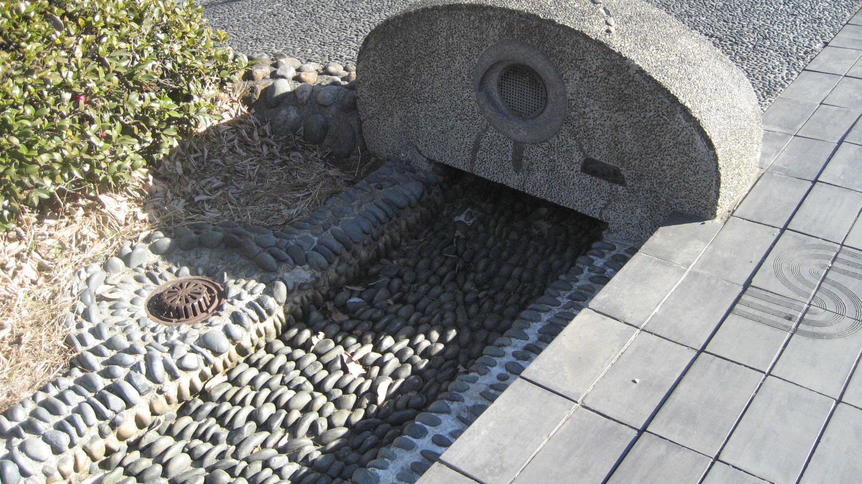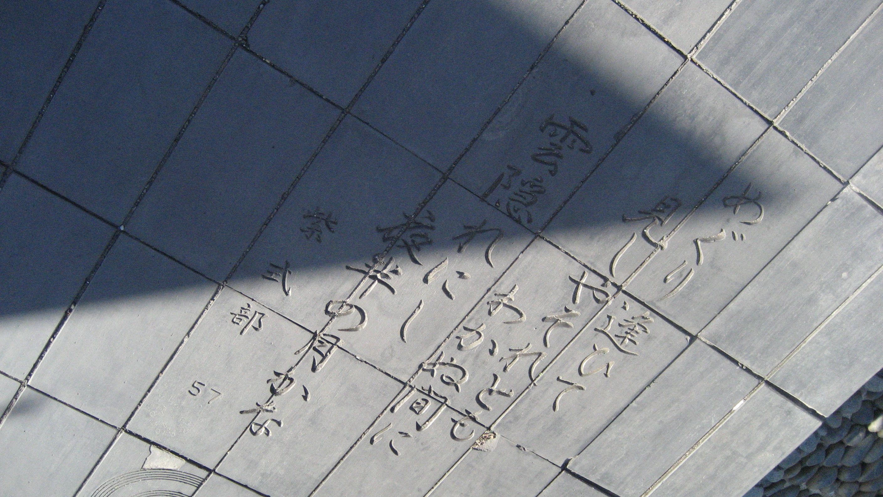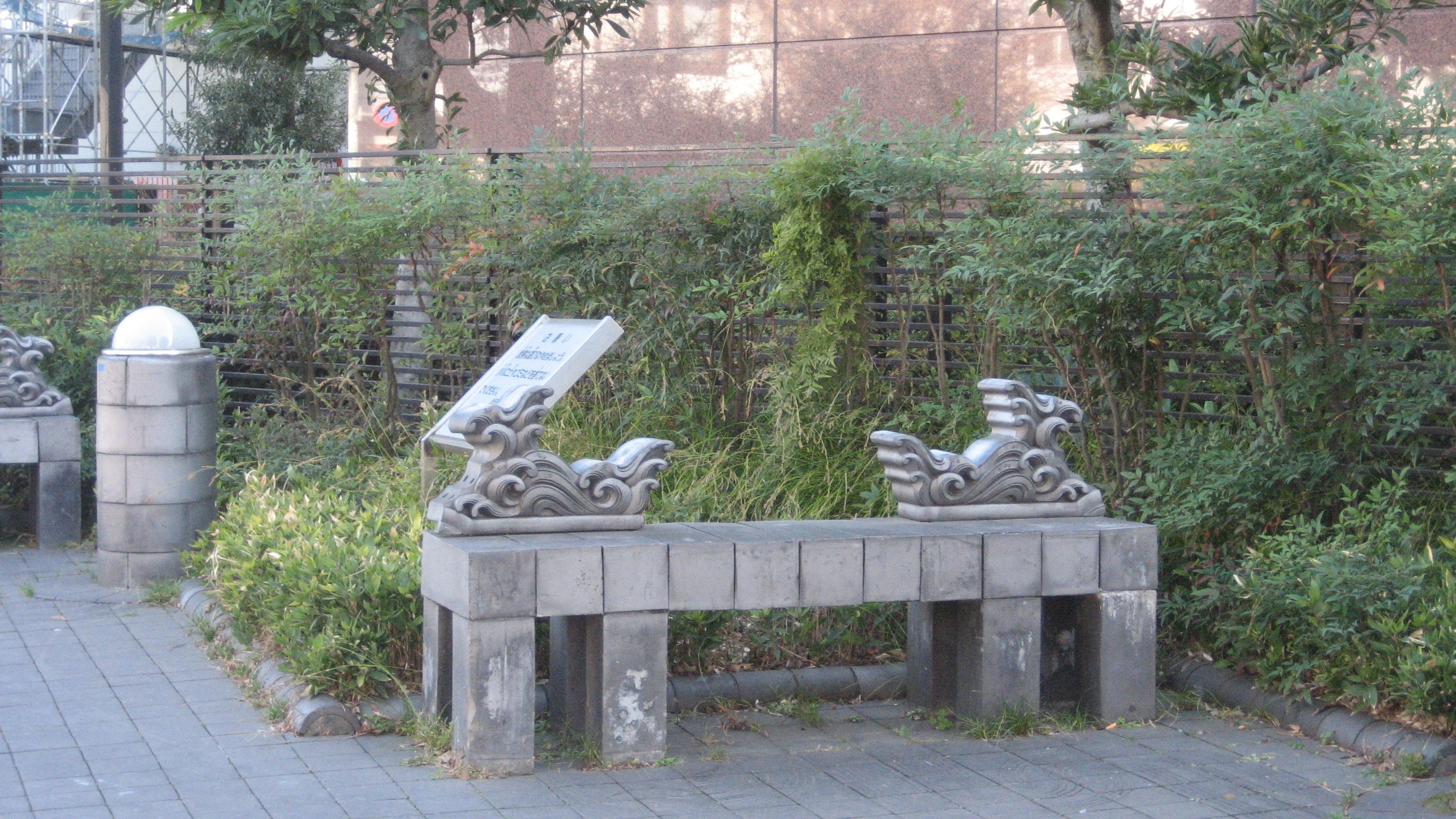 ​  いらかの道 ……座る場所の少ないベンチを見て分かりました。「いらか」=「瓦・甍」カワラを使うのが基本コンセプトだったようです。灰色をした瓦、「淡路瓦」と言い400年の歴史があるそうです。百人一首があった歩道も瓦なのでしょう。​
