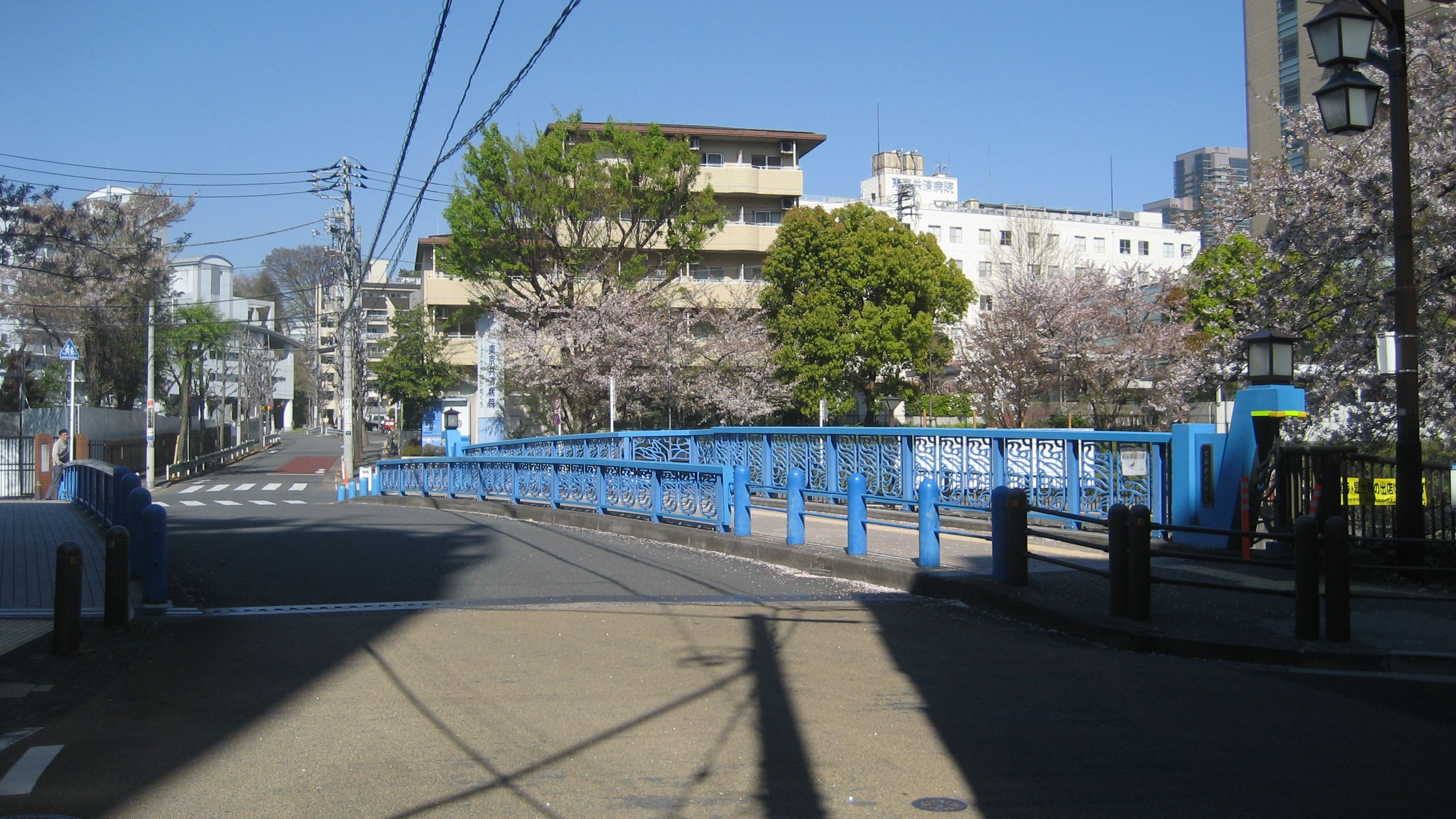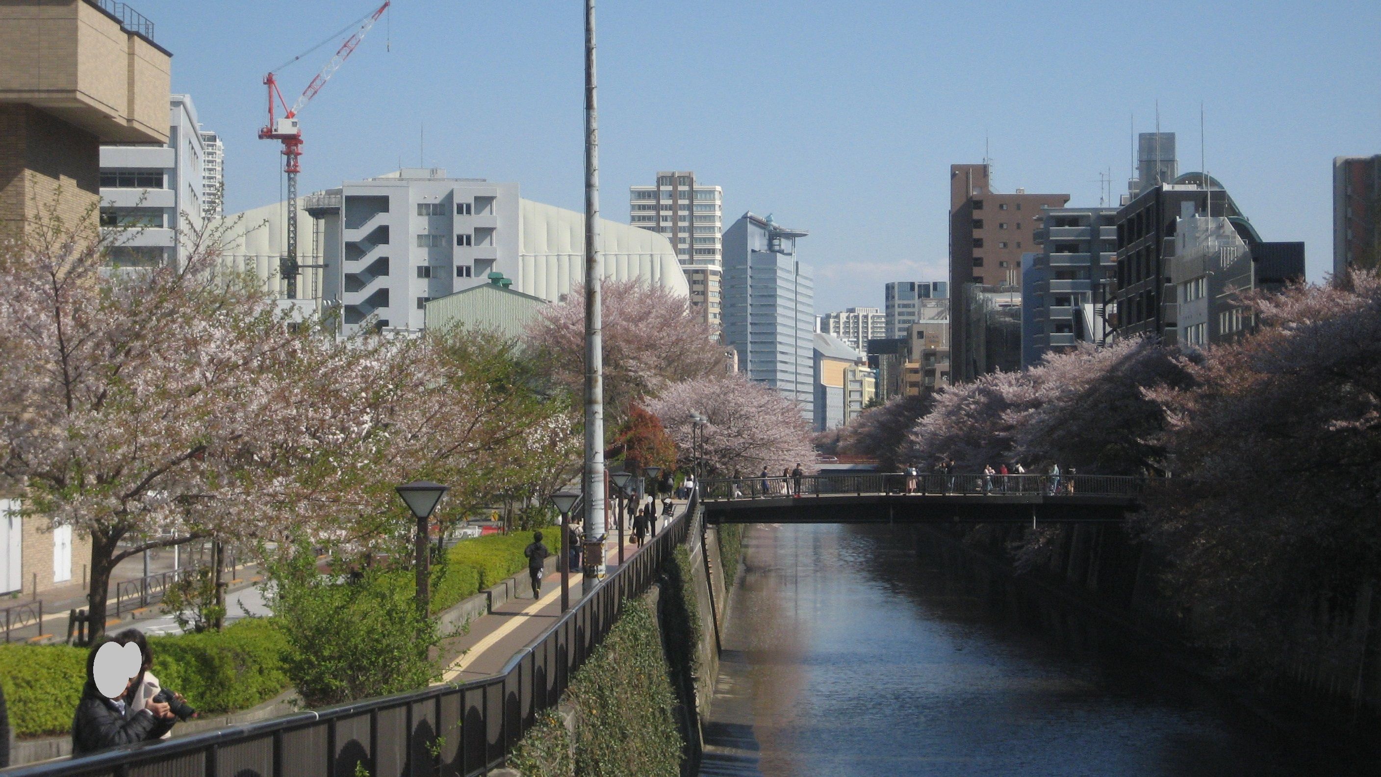 ​  目黒川下流方向 ……向こうの橋は「なかめ公園橋」っていうのかしら? 田楽橋には人がいなかったのに、結構にぎわっていました。​