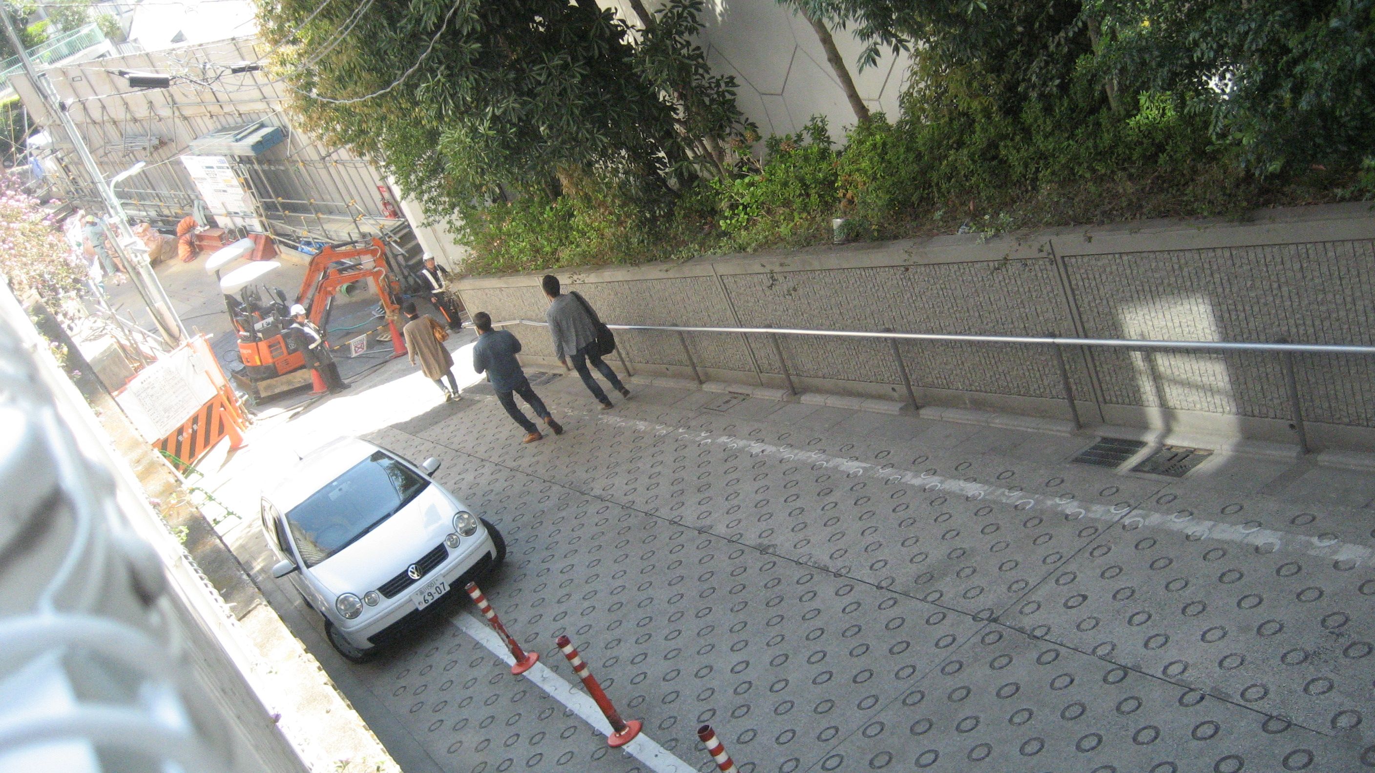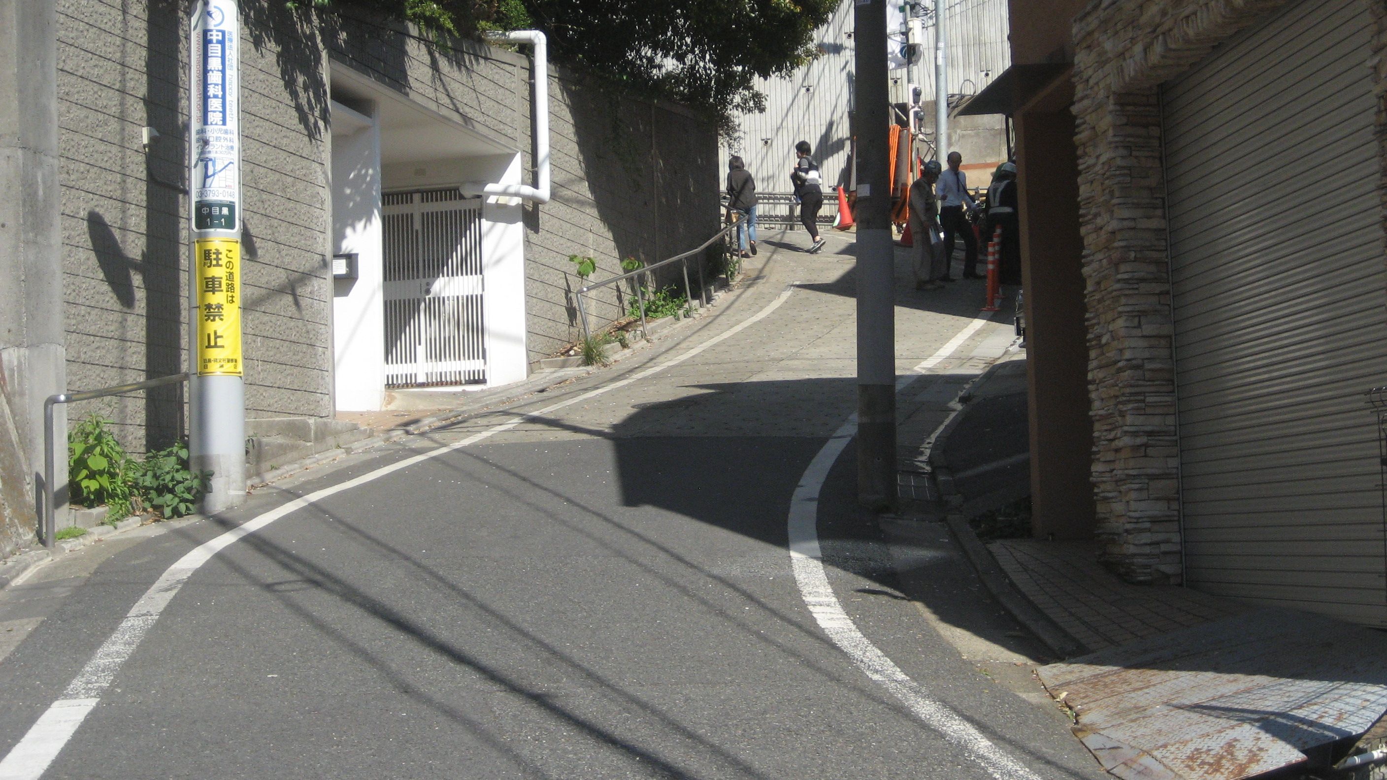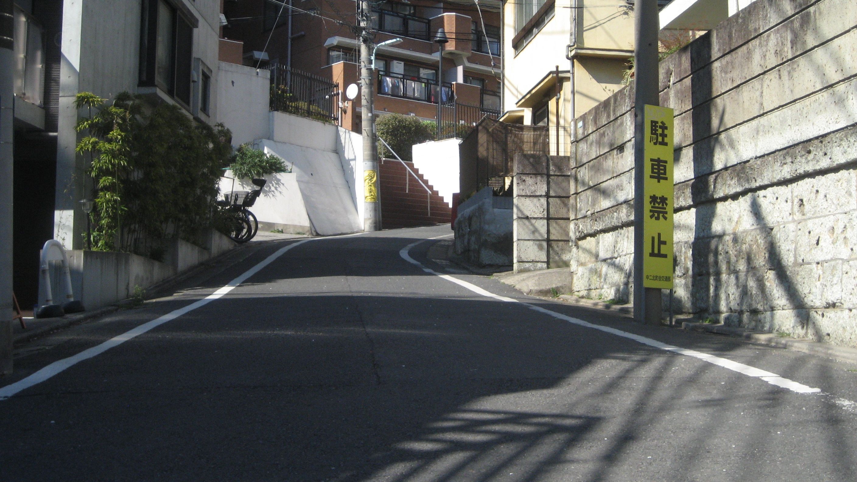 ​ 坂を上から見たら ……車は U ターンできるかしら?​ 切り返し面倒だけど、パワステだから大丈夫か……​