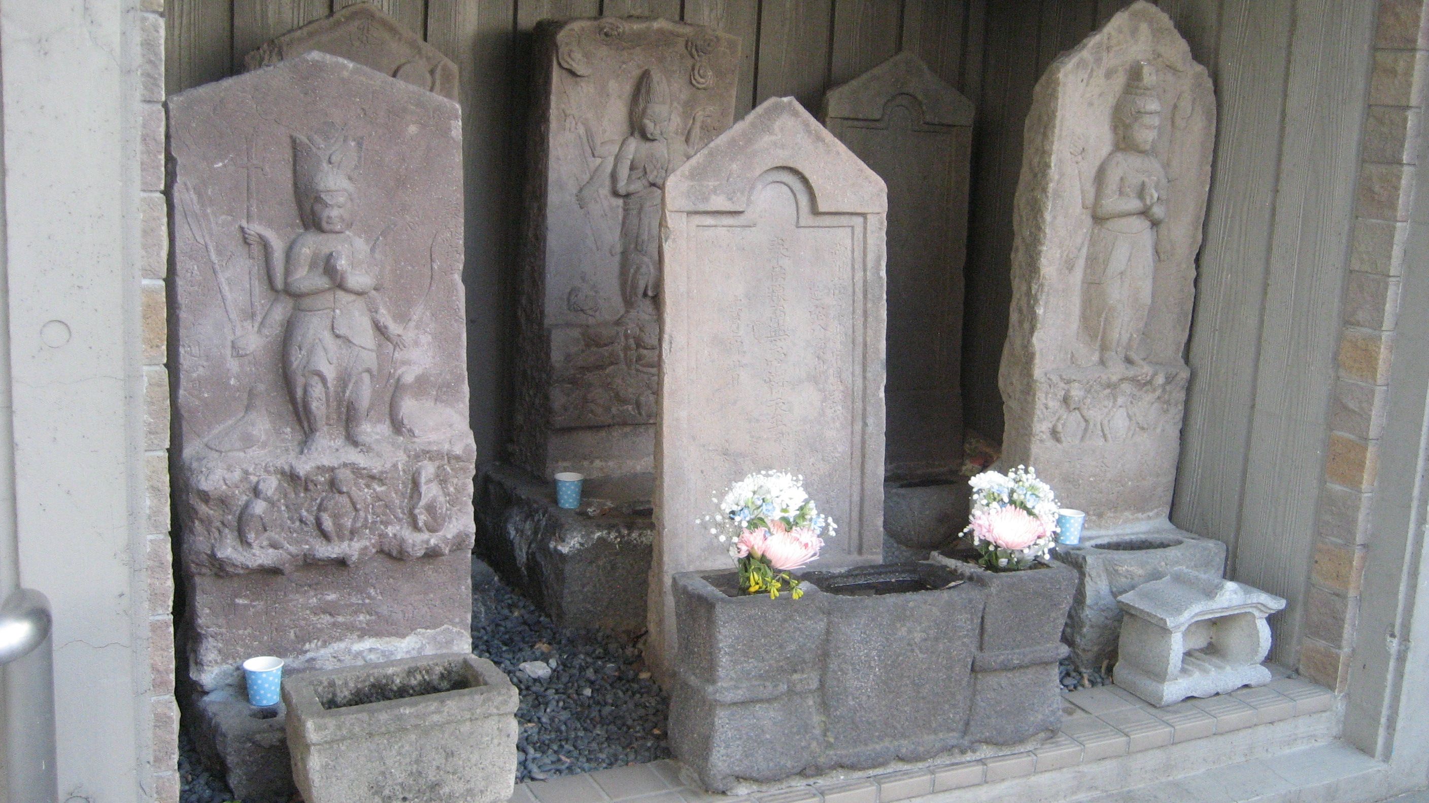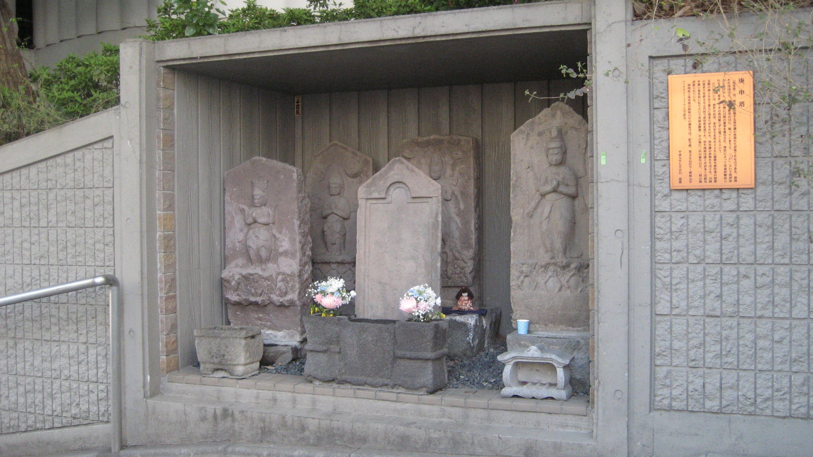 ​  別所坂上庚申塔​ ……​ 1665 1764 年のものだって。 4 基には青面金剛と三猿などが彫られています。​