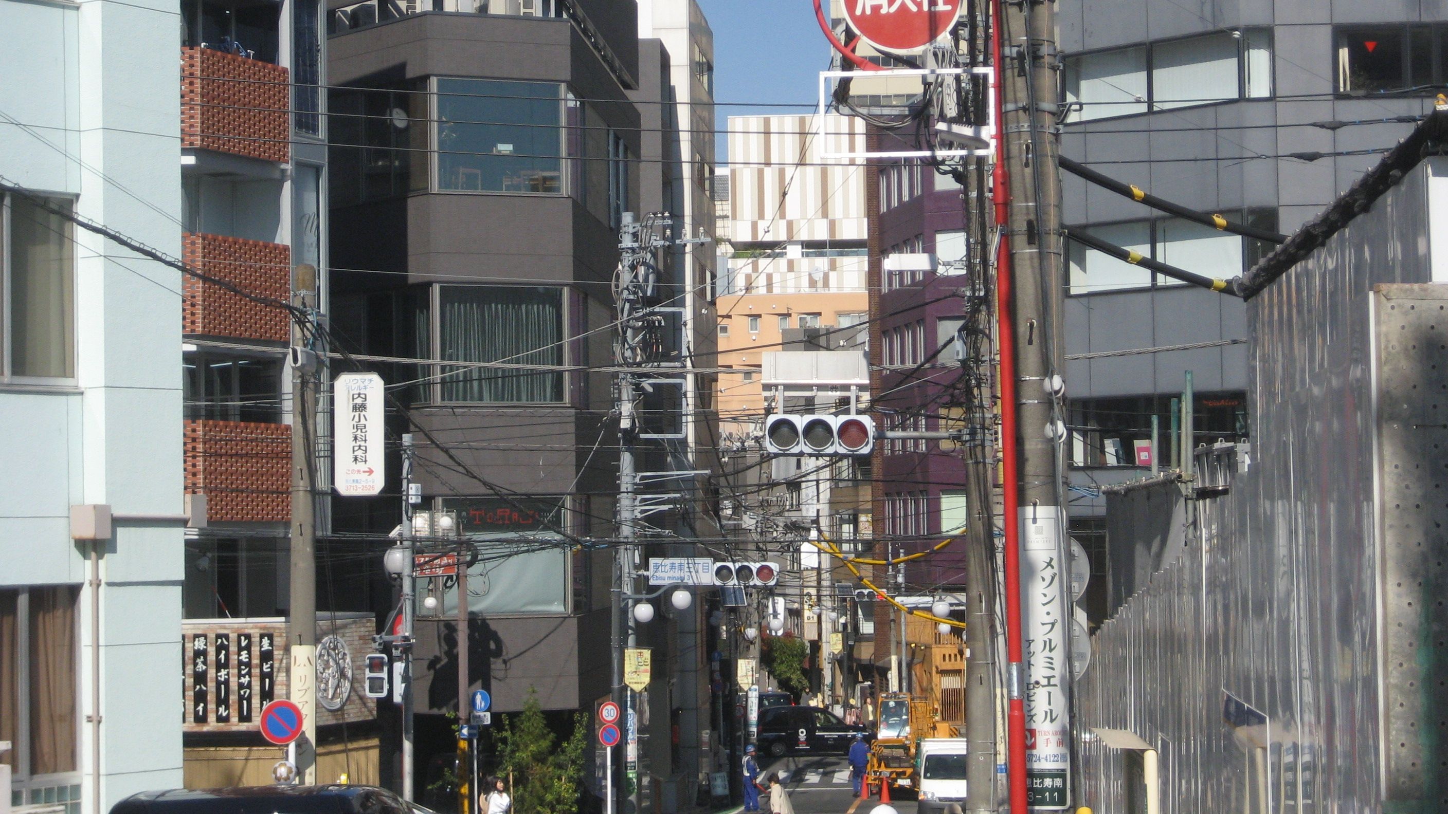 恵比寿南三丁目交差点に向かって下ります。どこも結構工事が多いです。