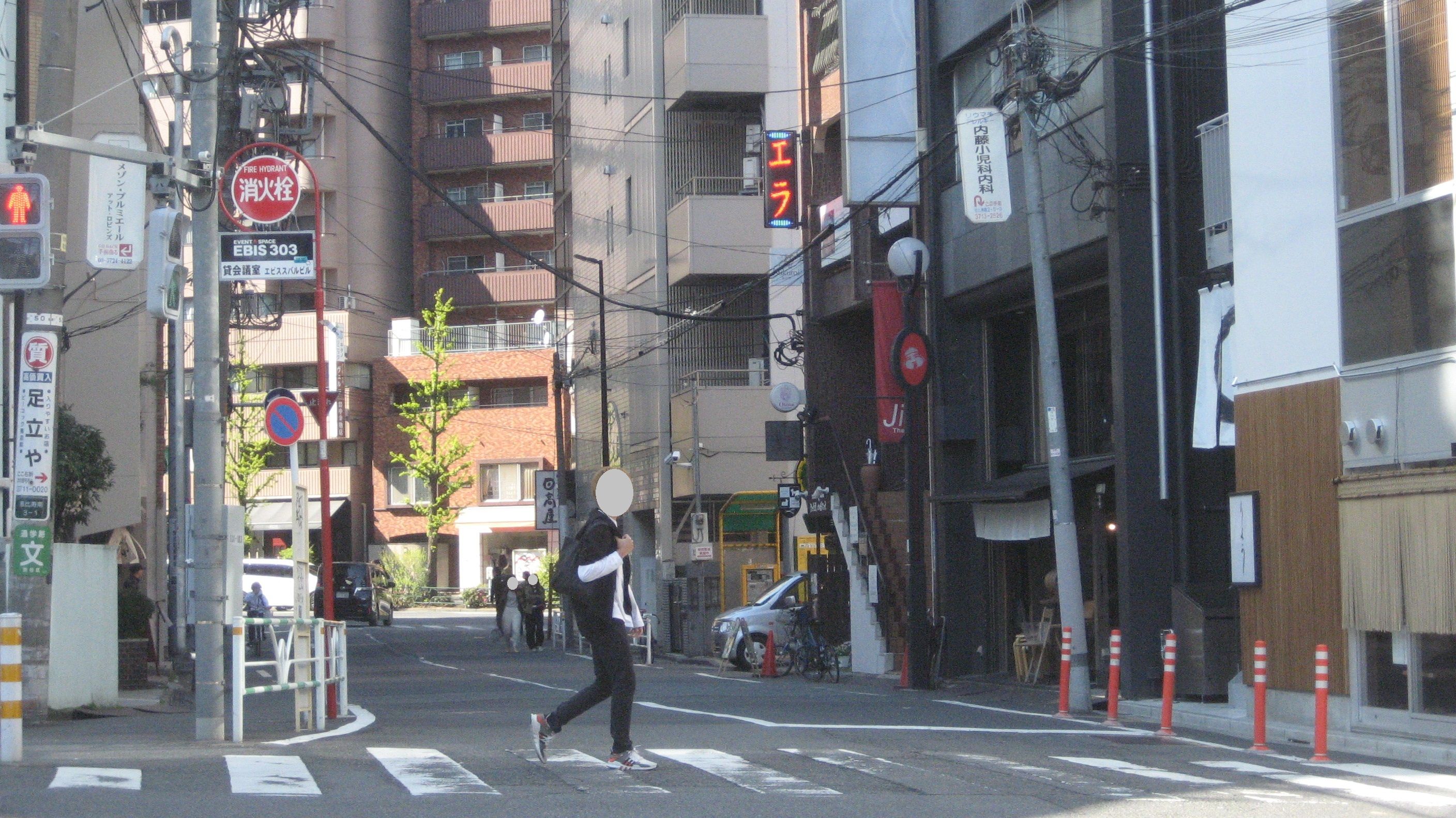 ​  すぐ先は恵比寿駅 ……​別所坂は意外に通行者が見られました。恵比寿駅を利用する方たちの通勤・通学路なのかもしれません。​