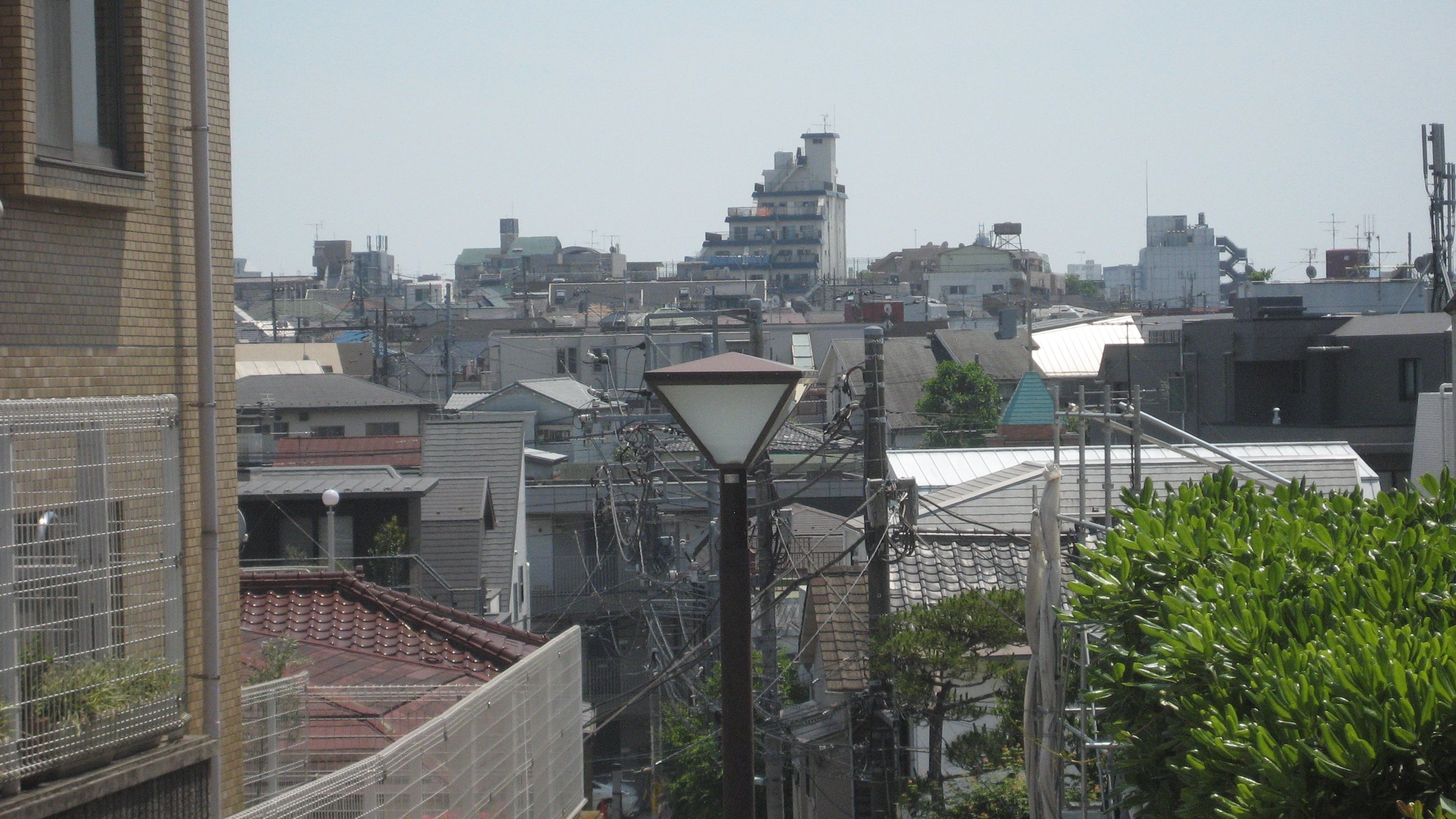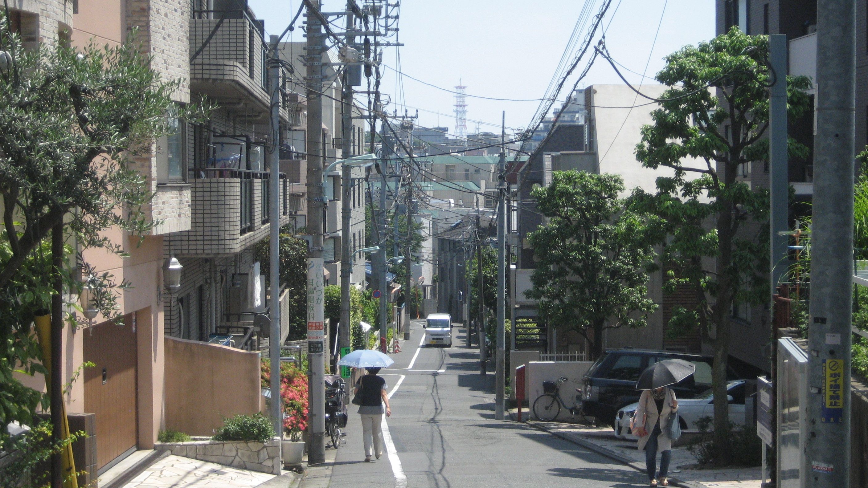 途中、進行方向右に南へ向かう坂道……蛇崩川に向かって下っているのですが、正面に唐ヶ崎電波塔も見えました。
