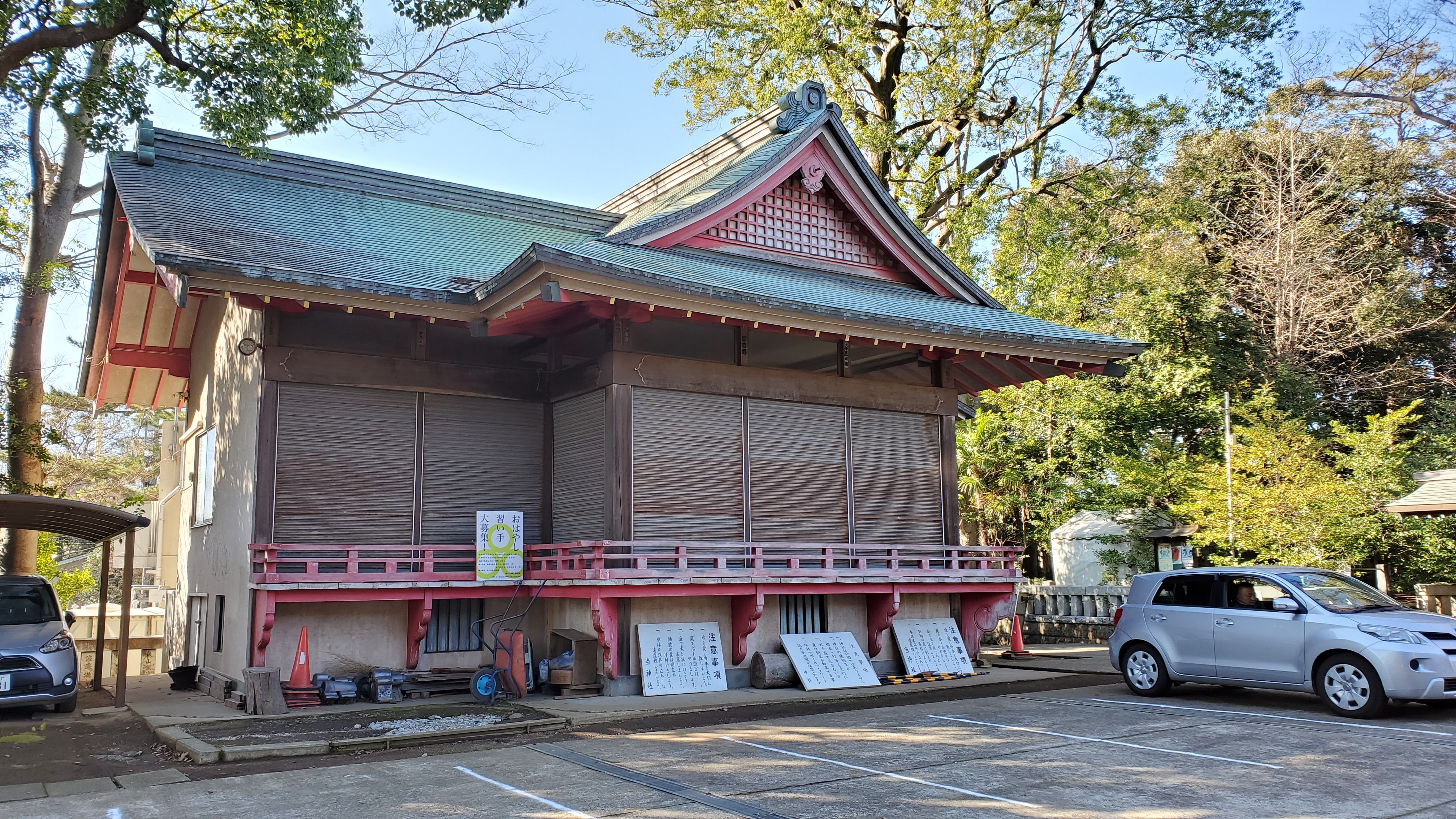 西側の参道を入ると神楽殿脇。南に向いた大鳥居が……また裏口入社しちゃいました。神楽殿前にひかれた白線は駐車場所みたいなので、車は西の鳥居から入ってくることになります。