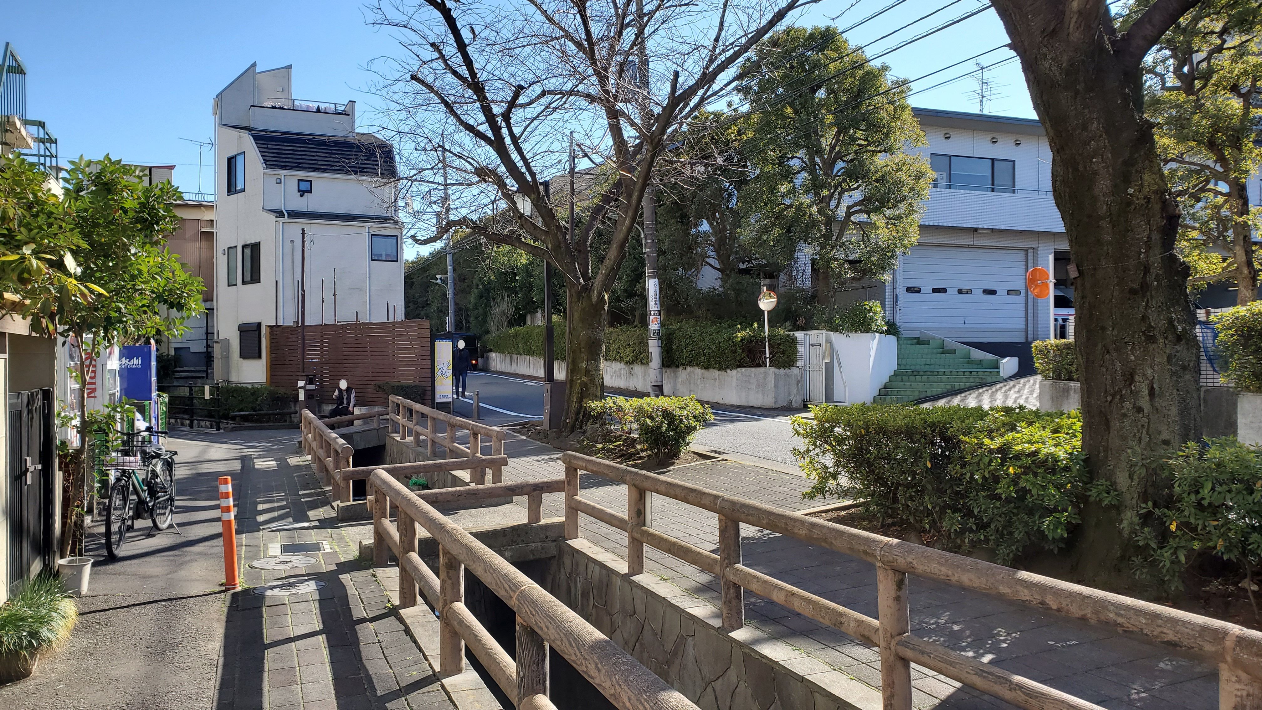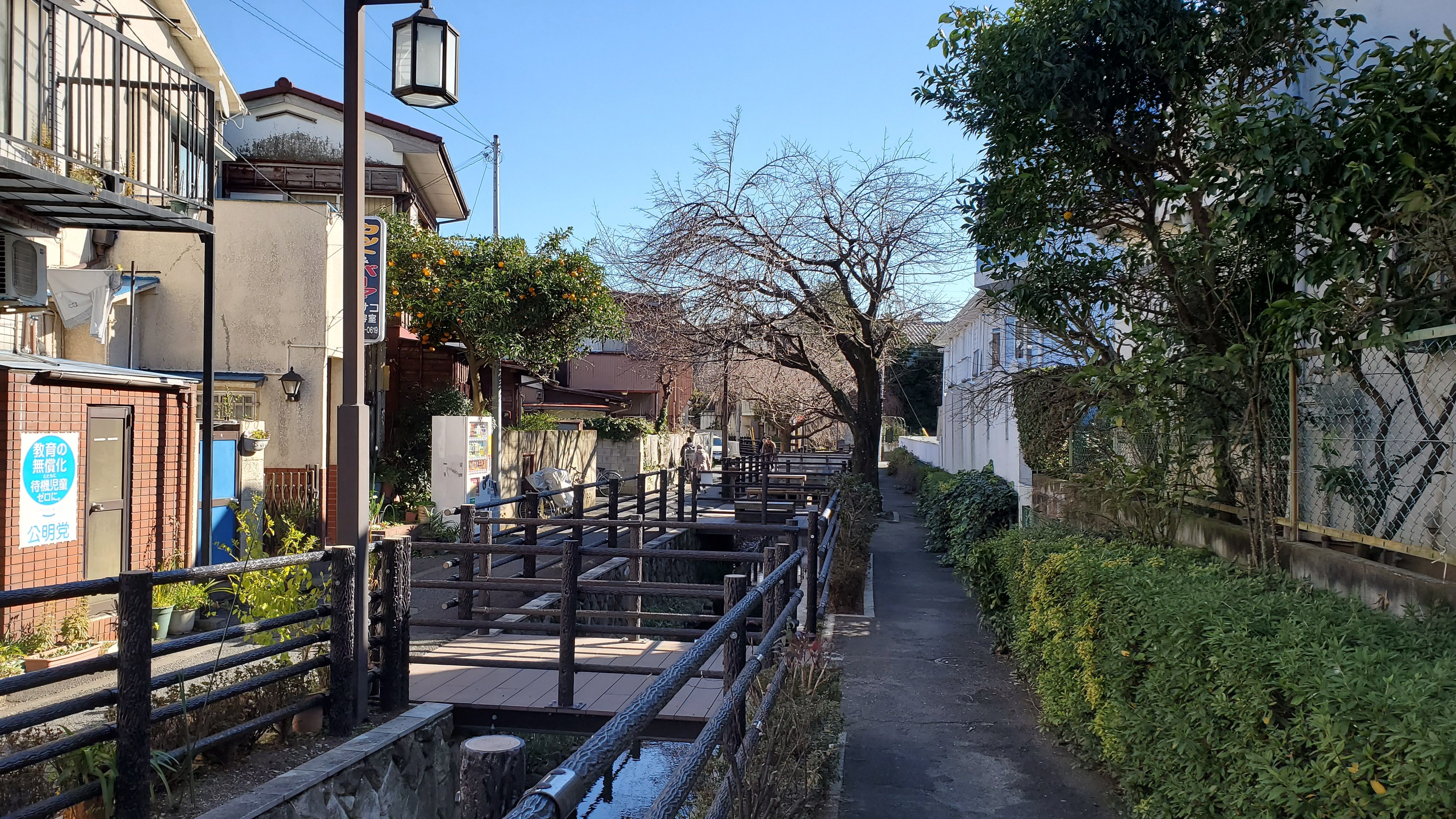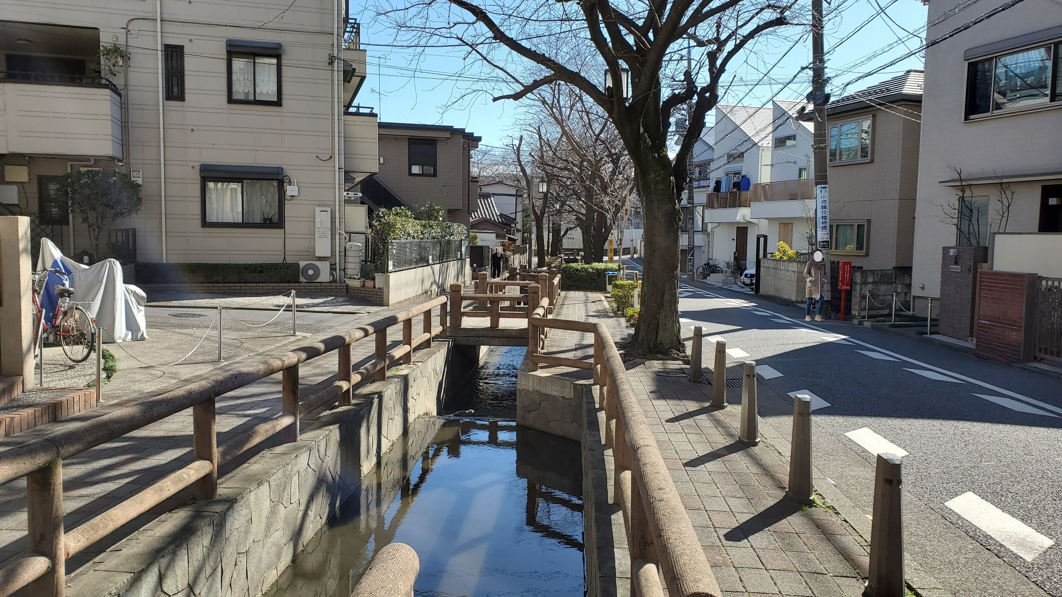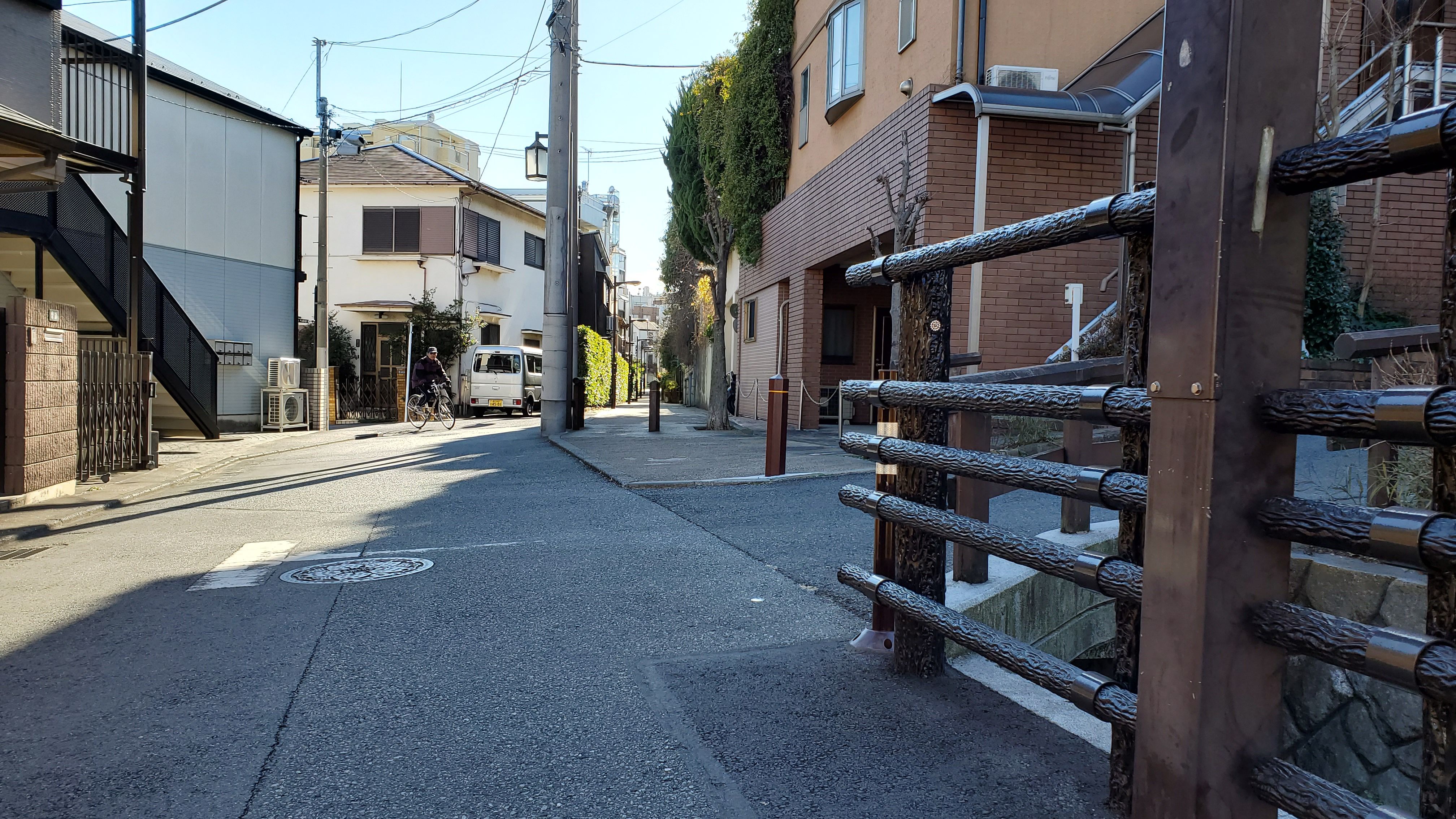 長慶寺脇の路地を抜けると新幹線の高架……高架をくぐった先が集落単位の共同洗い場があったとされる池上根方(現在の仲池上一・二丁目)ですが、実際には洗足流れというより、呑川にあったのではないかと思う私です。