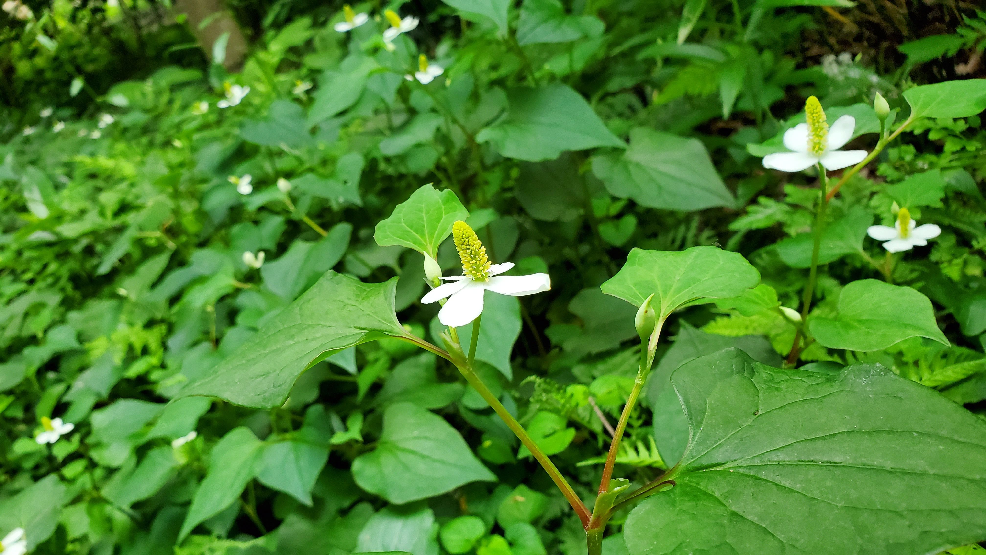 繁殖するドクダミを見ながら……毒がありそうだけど、「毒矯」毒を抑えるって意味に由来するとか。民間治療薬に使われて来たらしい。赤ひげ先生も使ったかも?