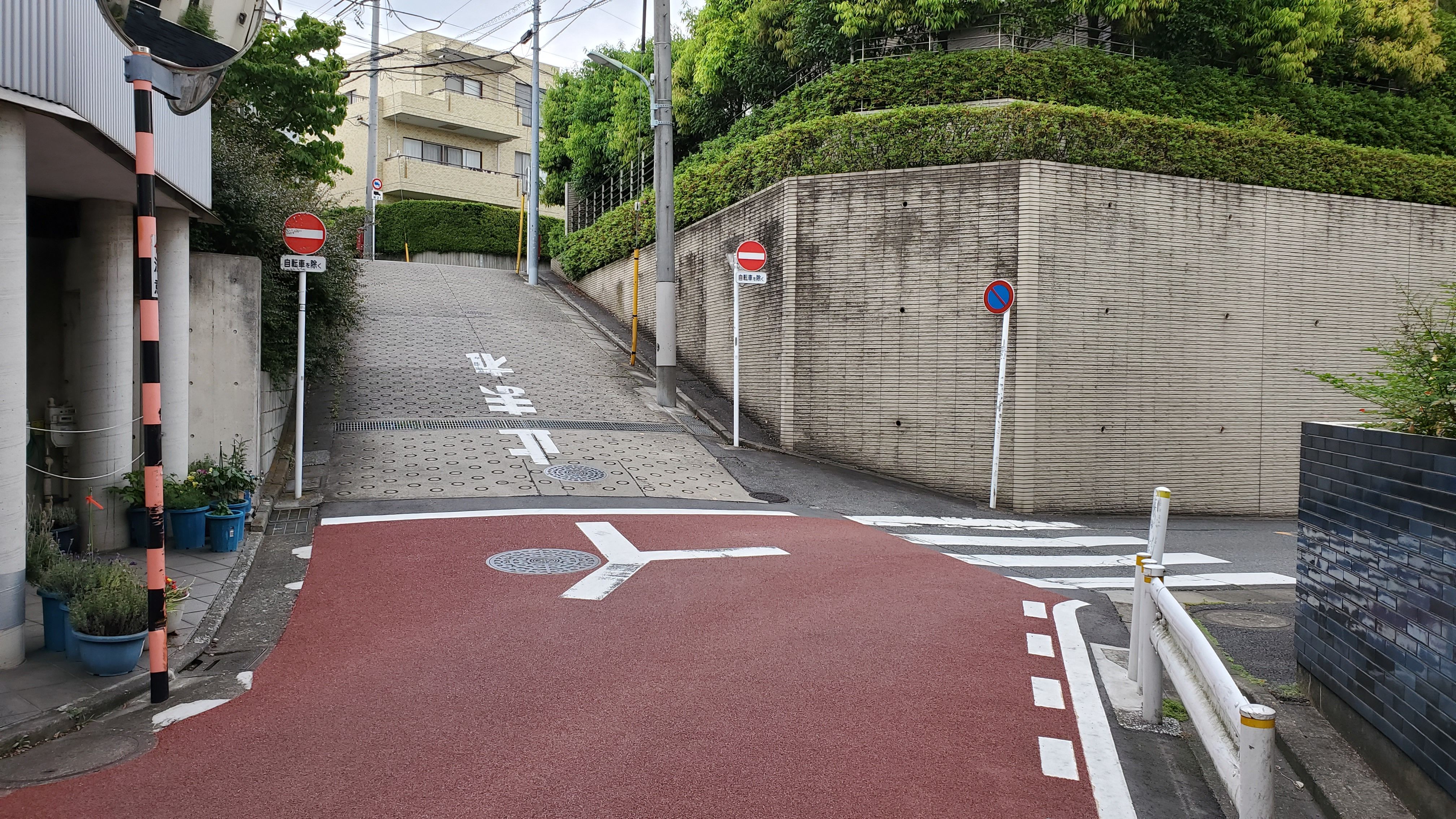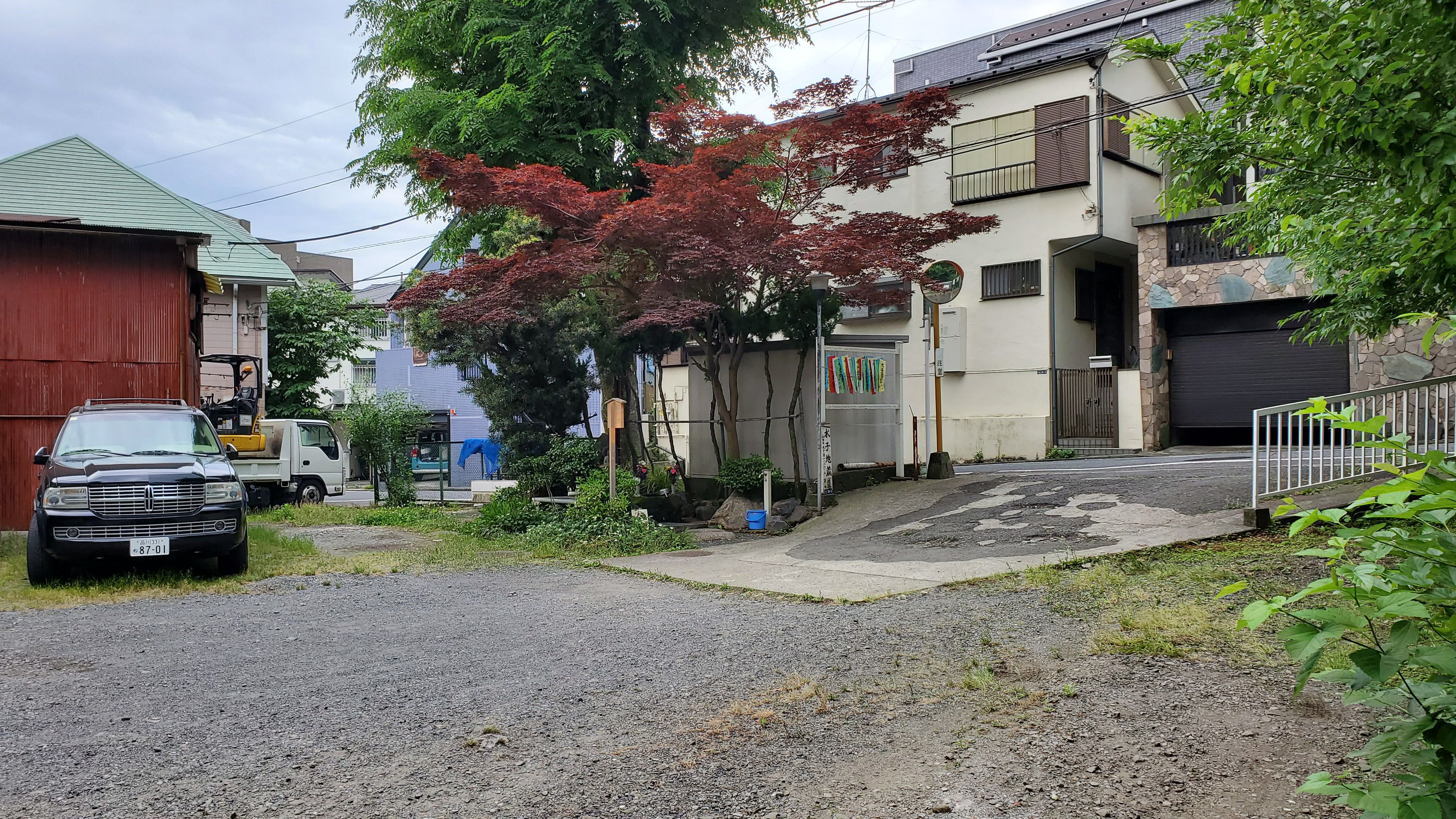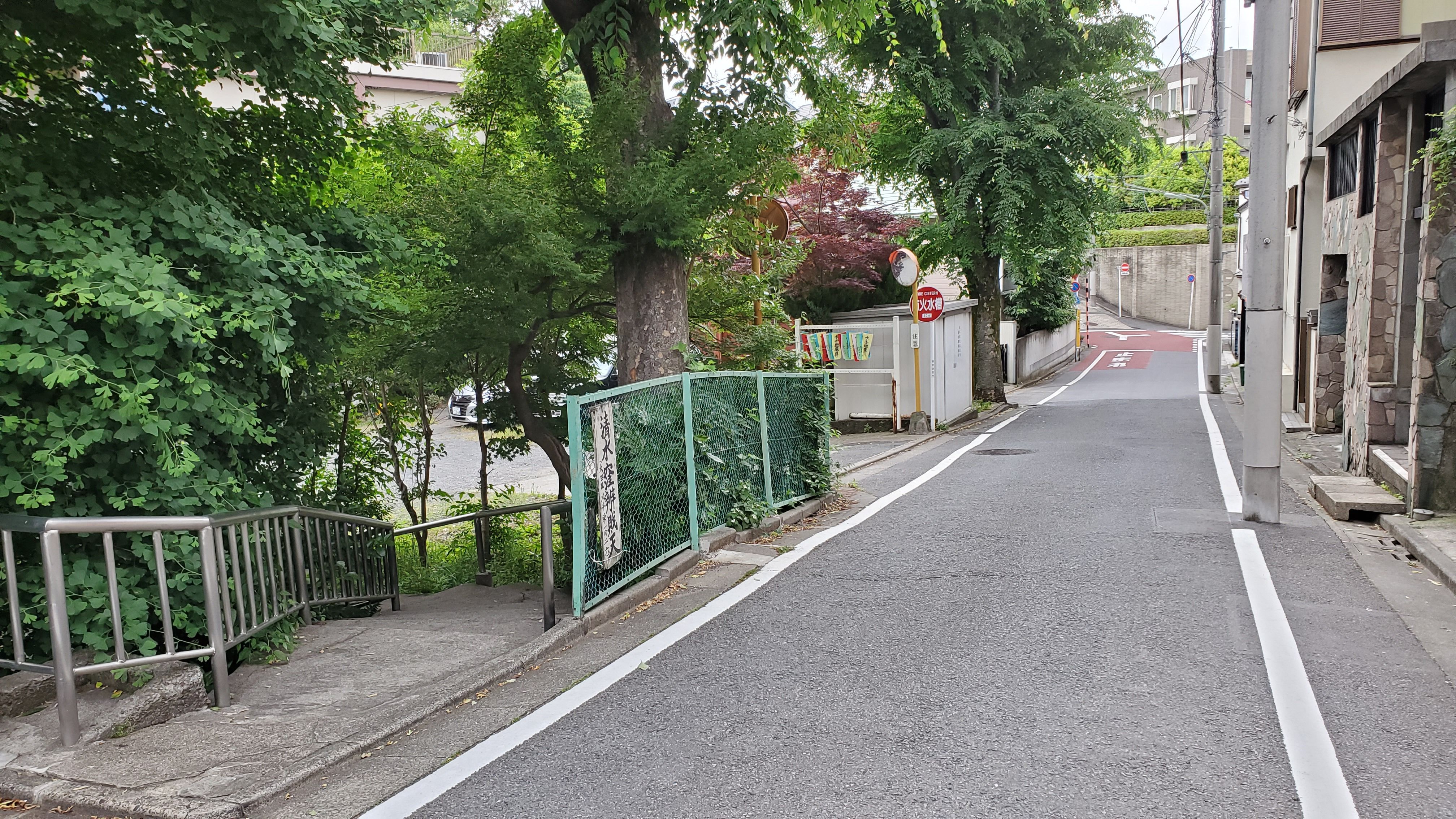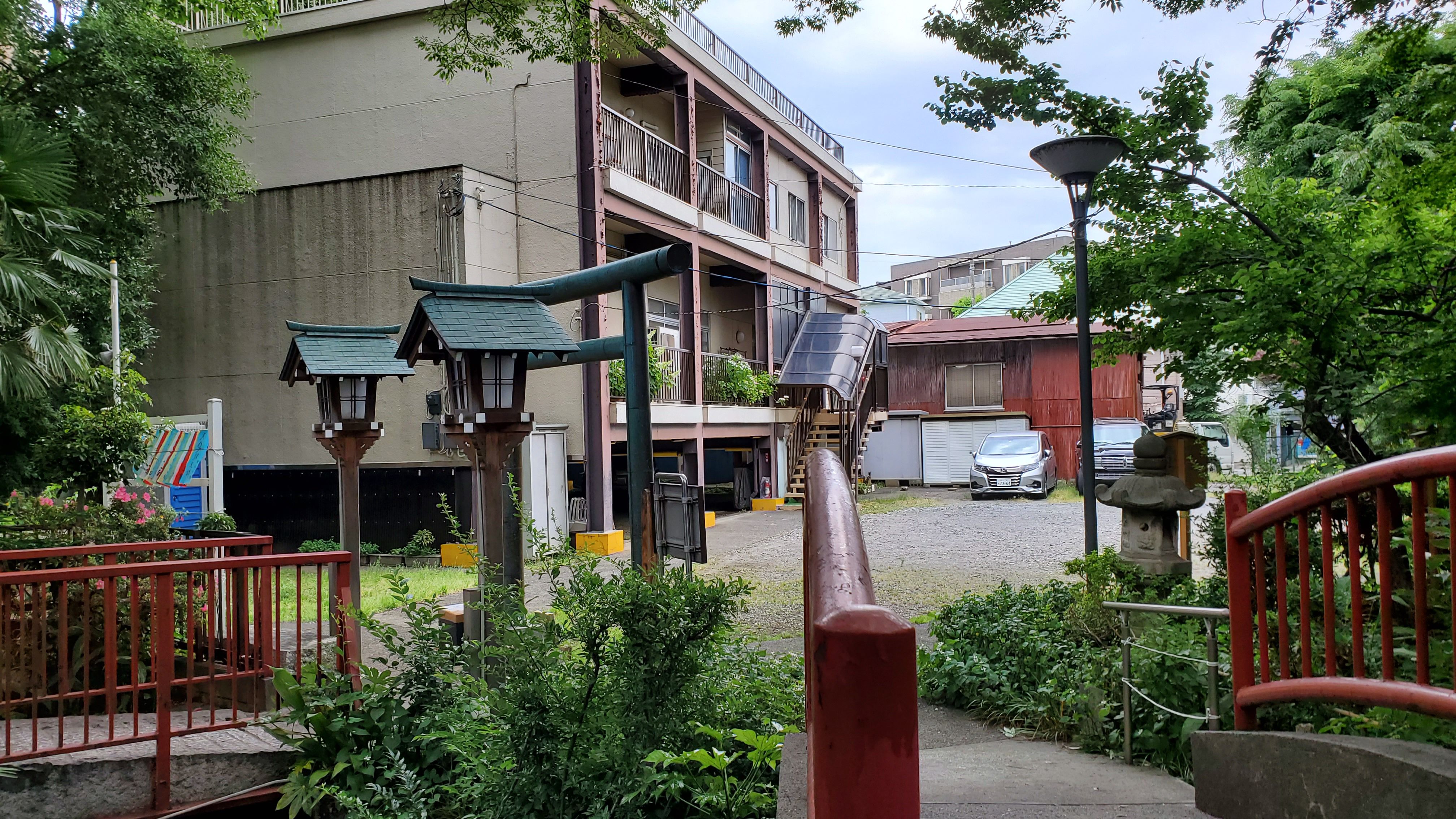 二つの赤い橋の交わるところから向こうはアパートかしら? それとも岸田家後裔(こうえい)のお住まいかしら?