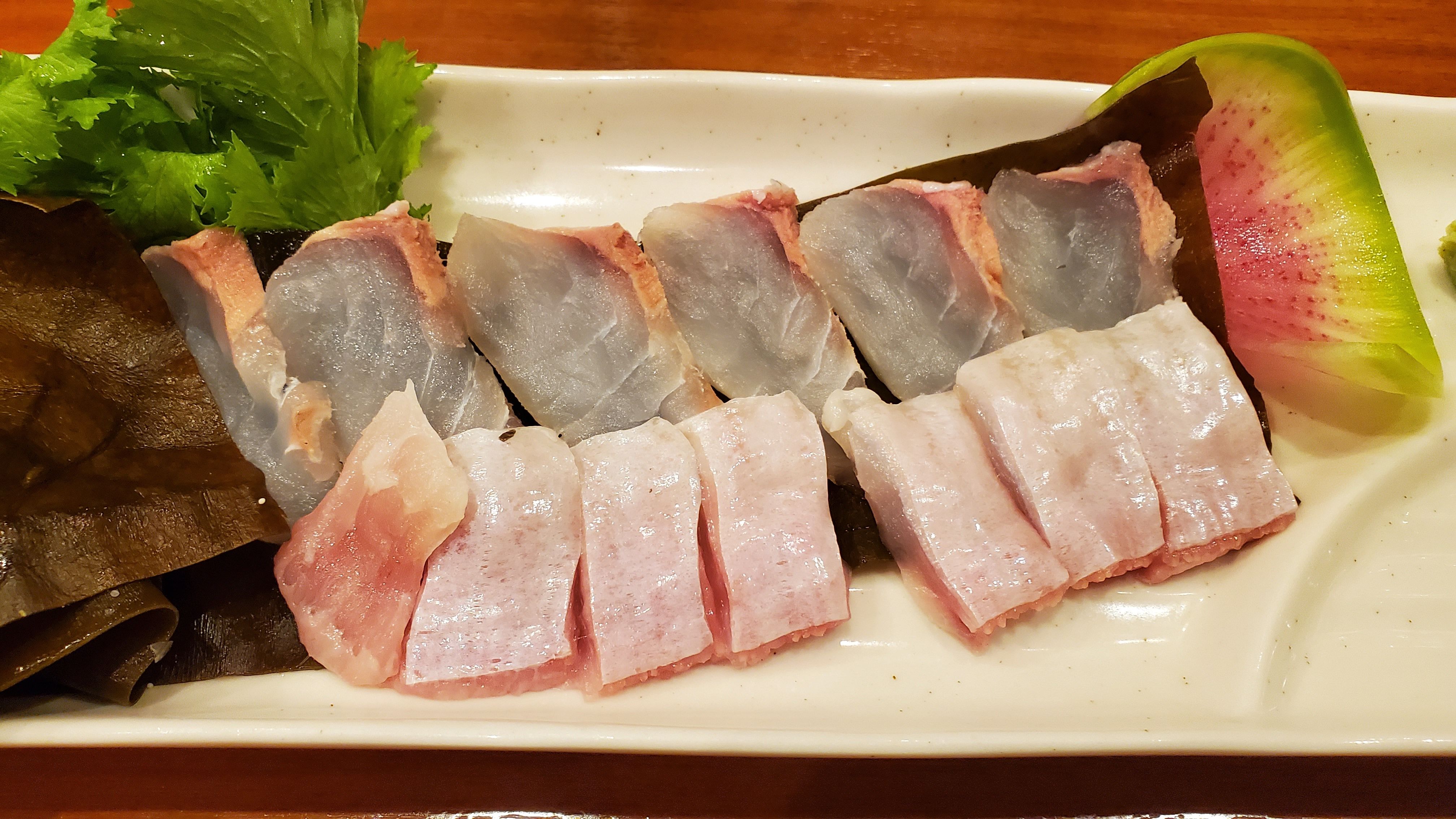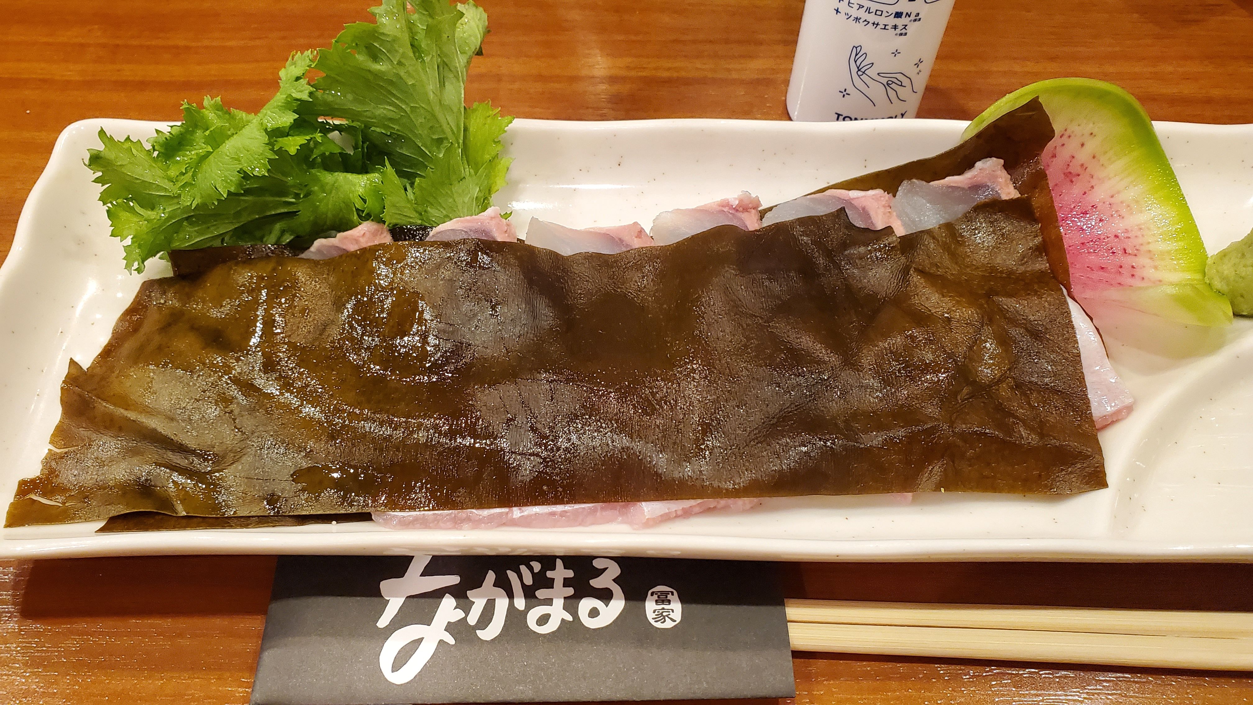 平目の昆布〆……先日おいしく頂きました。昆布〆用の昆布らしいですが、指で裂いて一緒に食べるとこれまた美味。河豚の昆布〆をやってみると言った折に頂戴したことがありますが、硬い出汁昆布よりも扱いやすく良かったです。流石 プロだけあって、いろいろと使い分ける主であります。いつもごちそうさま~