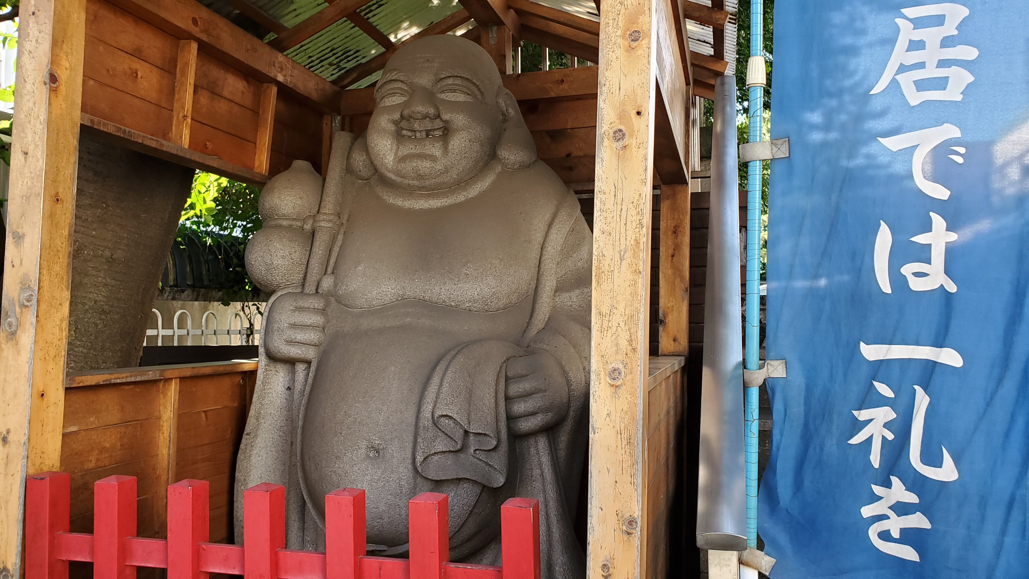 大きな布袋さん……国際自動車の創始者が、建設した社屋に 社運の礎として 建立したもの。平成20年、社屋移転にともないここに遷座されたと。