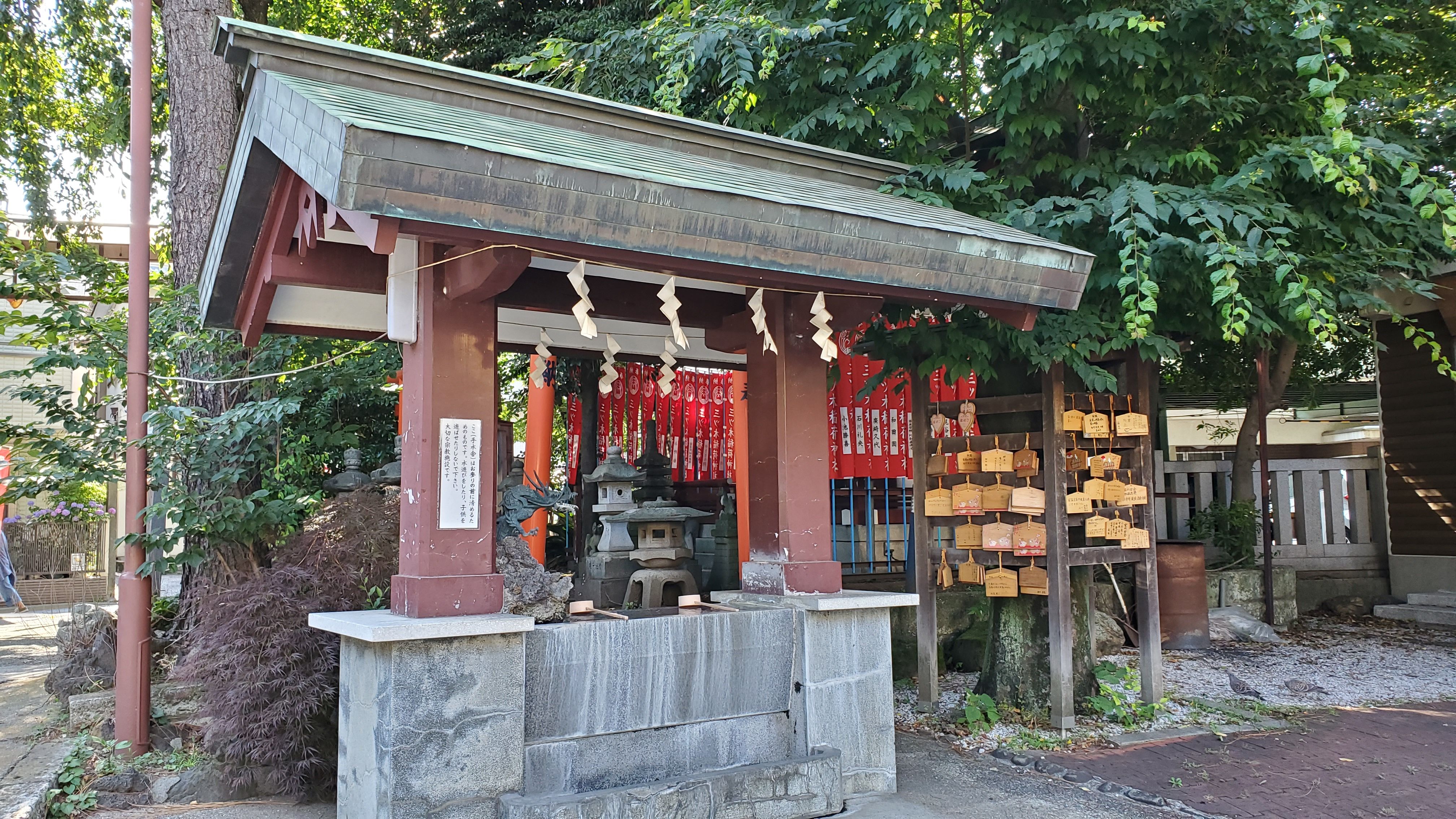 手水舎の右に絵馬掛け……なぜかハート形の絵馬もあった。