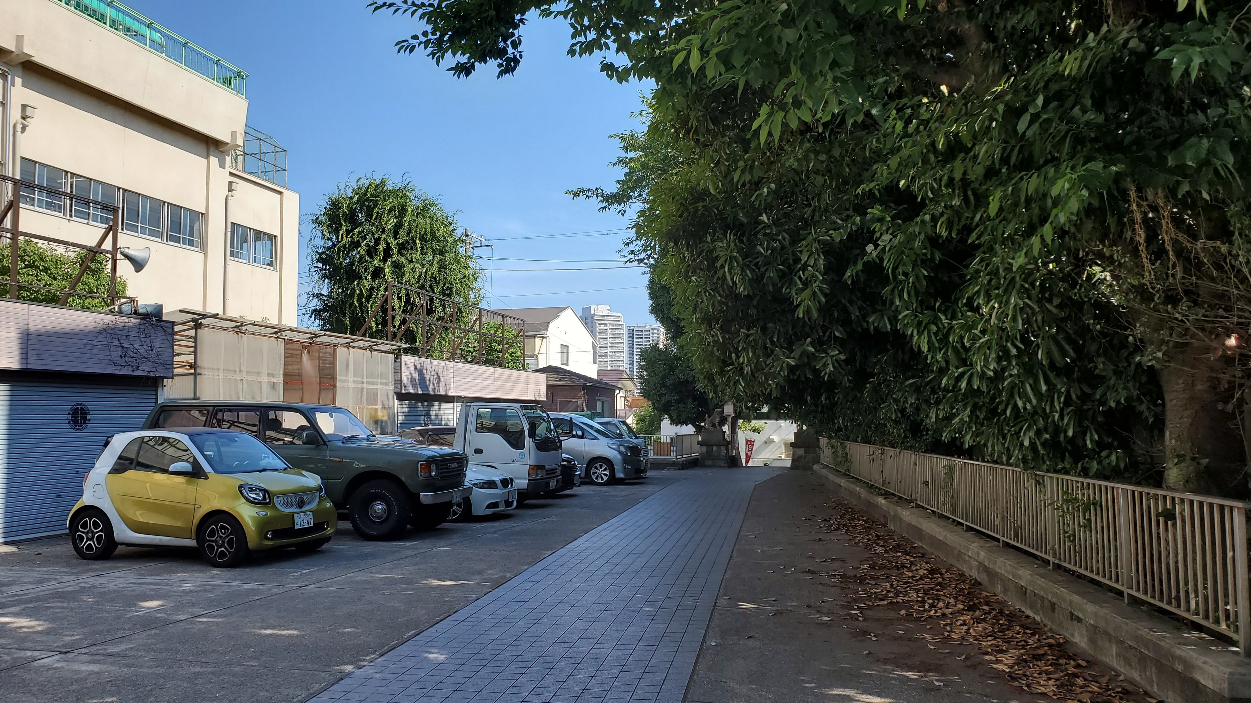 参道……左は区立三木小学校。「三ツ木村」の地名が今も残っています。