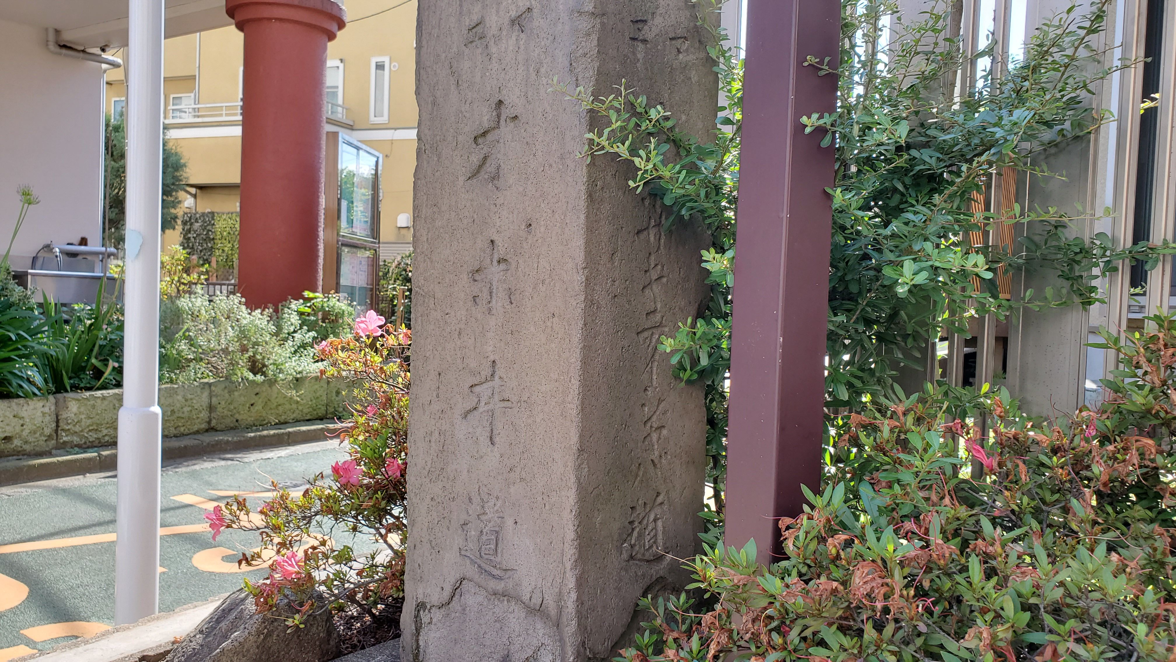 正面には「マエ オホヰ道」、左には「マエ ヘビクボ道」と刻まれています。建立時の場所は違っていたのだが、大井や蛇窪の方向は正しい。さほど離れていた分けではなさそう。