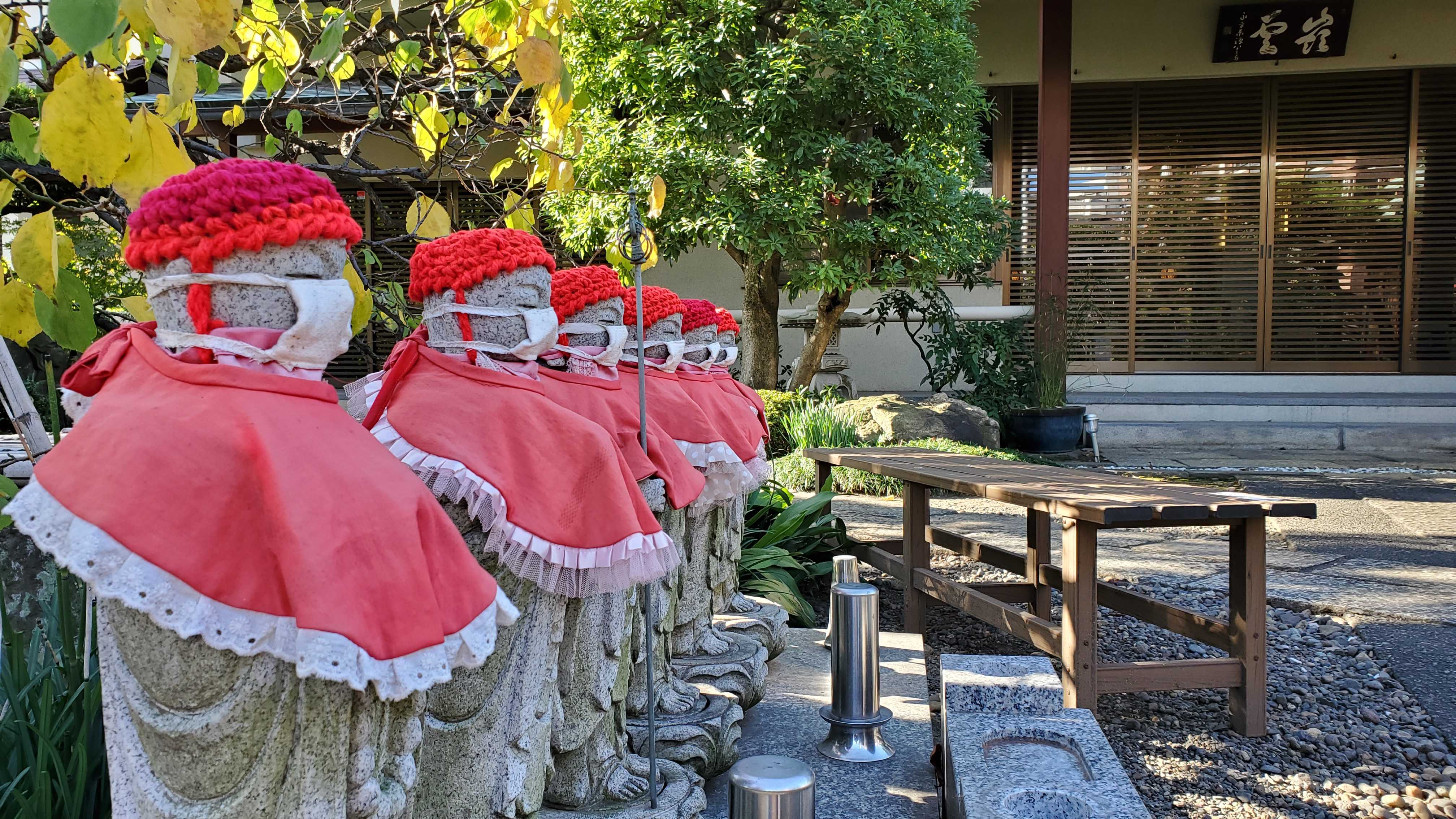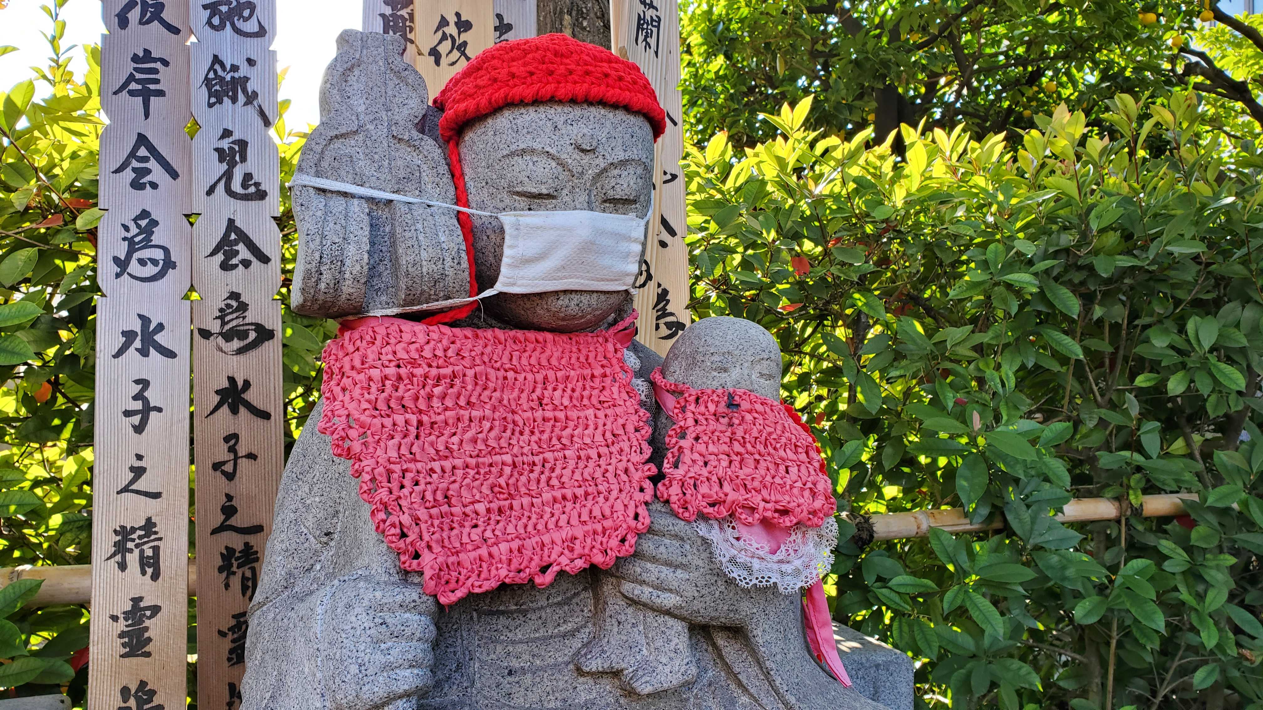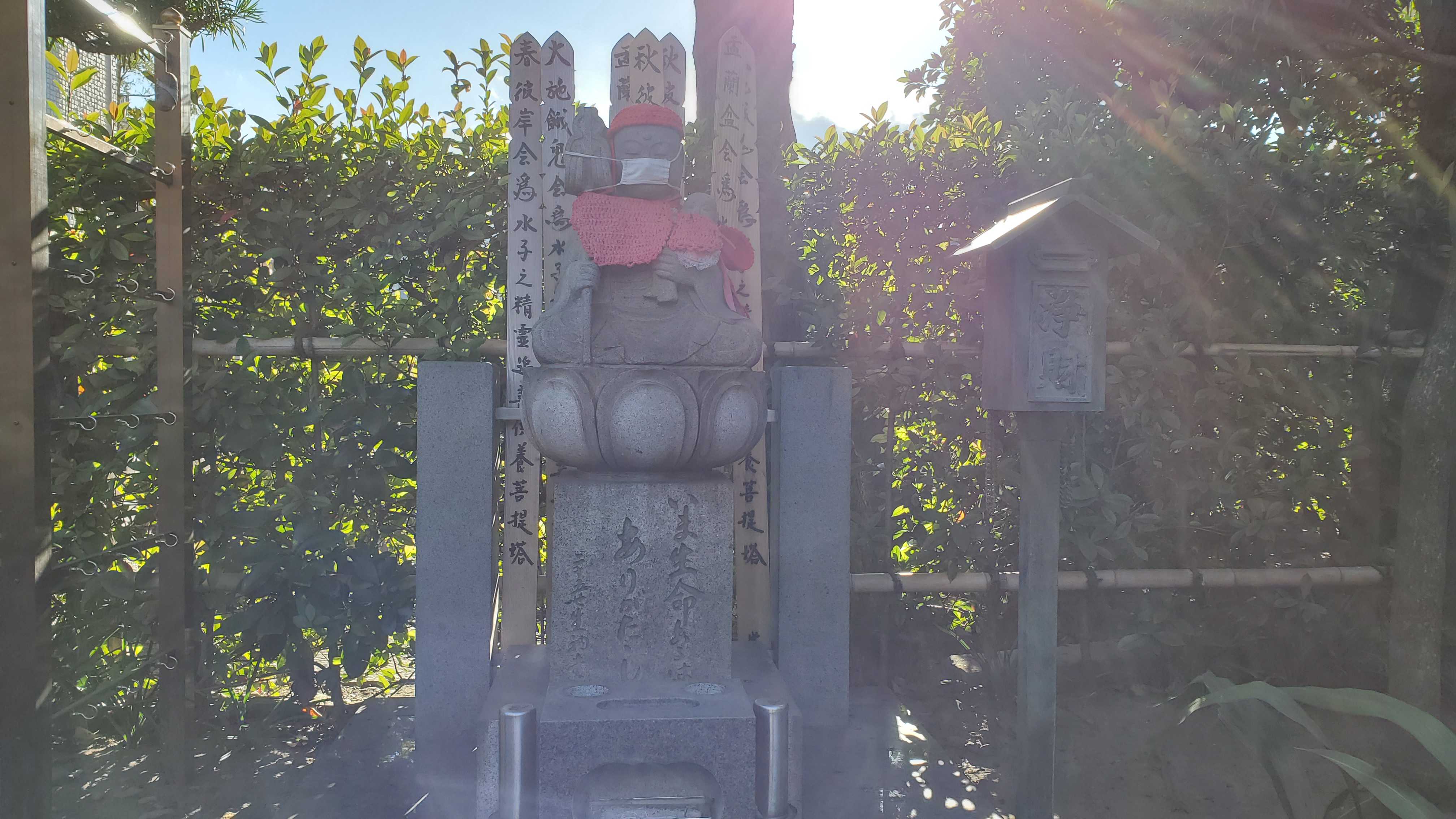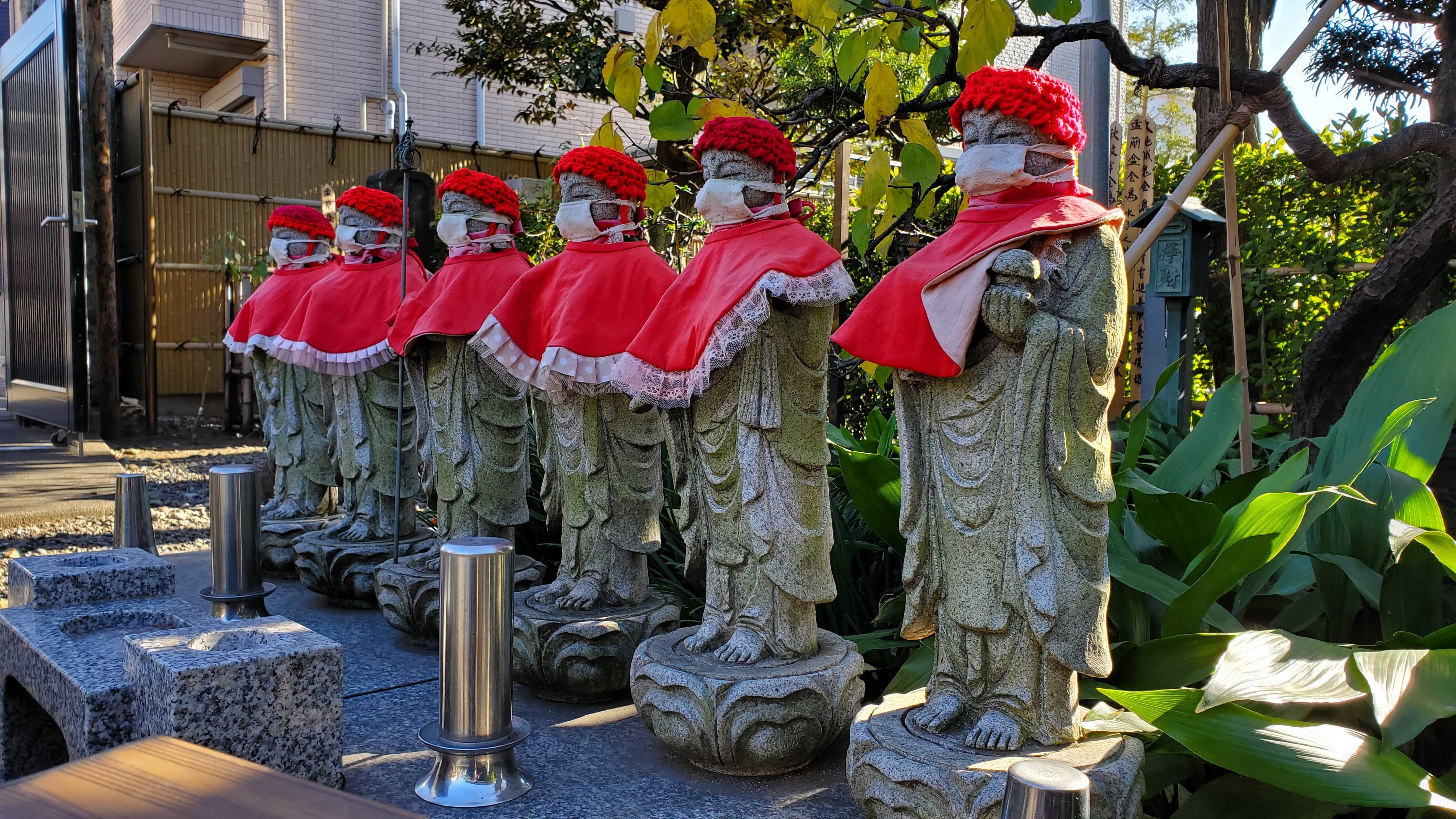 みなさんマスク……六地蔵は、 合掌・ 数珠・宝珠に錫杖など異なるのでしょうが、赤い前掛け?マントを着用されていたので分かりませんでした。