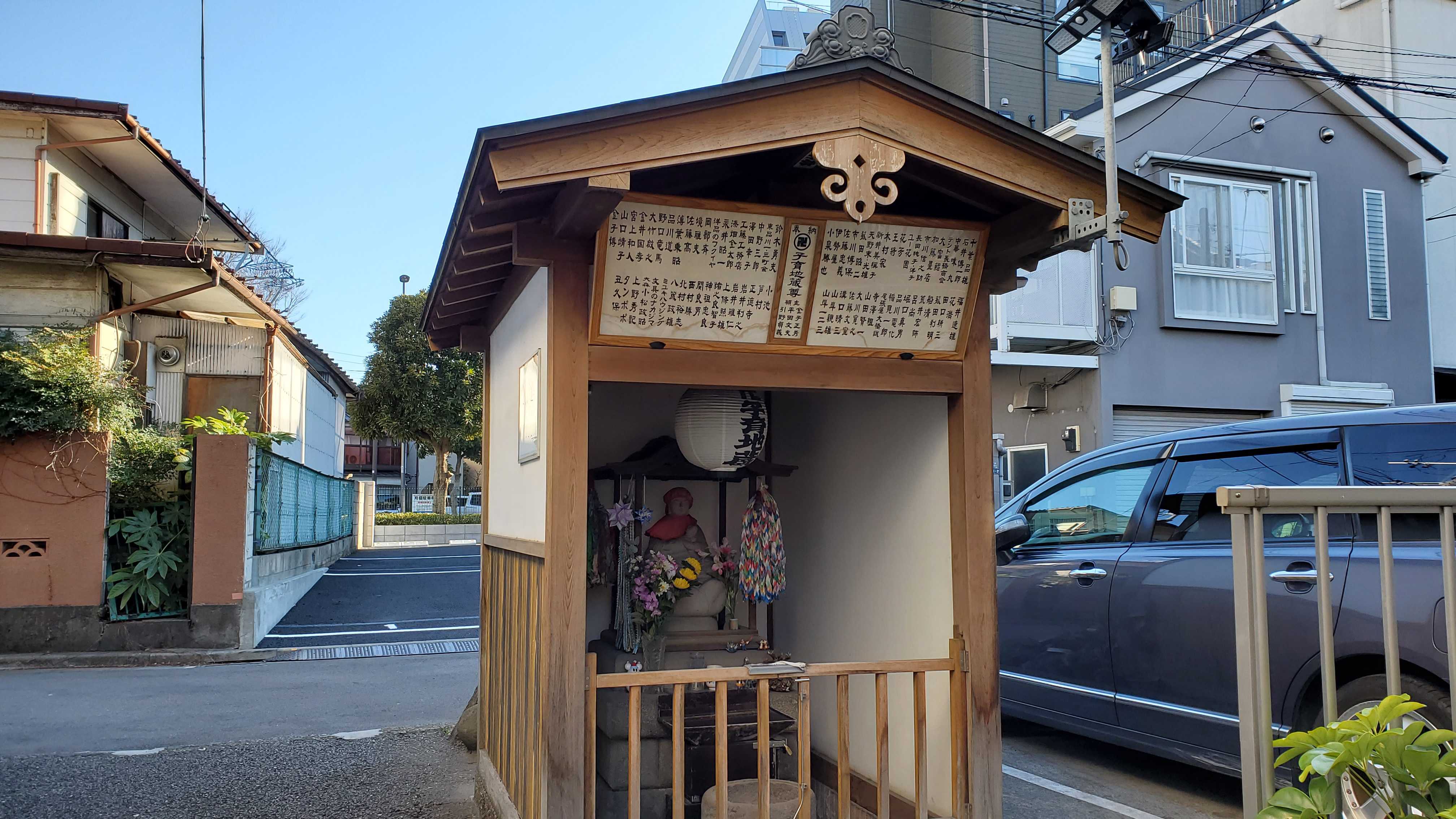 地蔵堂の後ろ……ここを流れていたんだな~ 今は、この地点から私の背後方向・100mほどに目黒川が流れています。