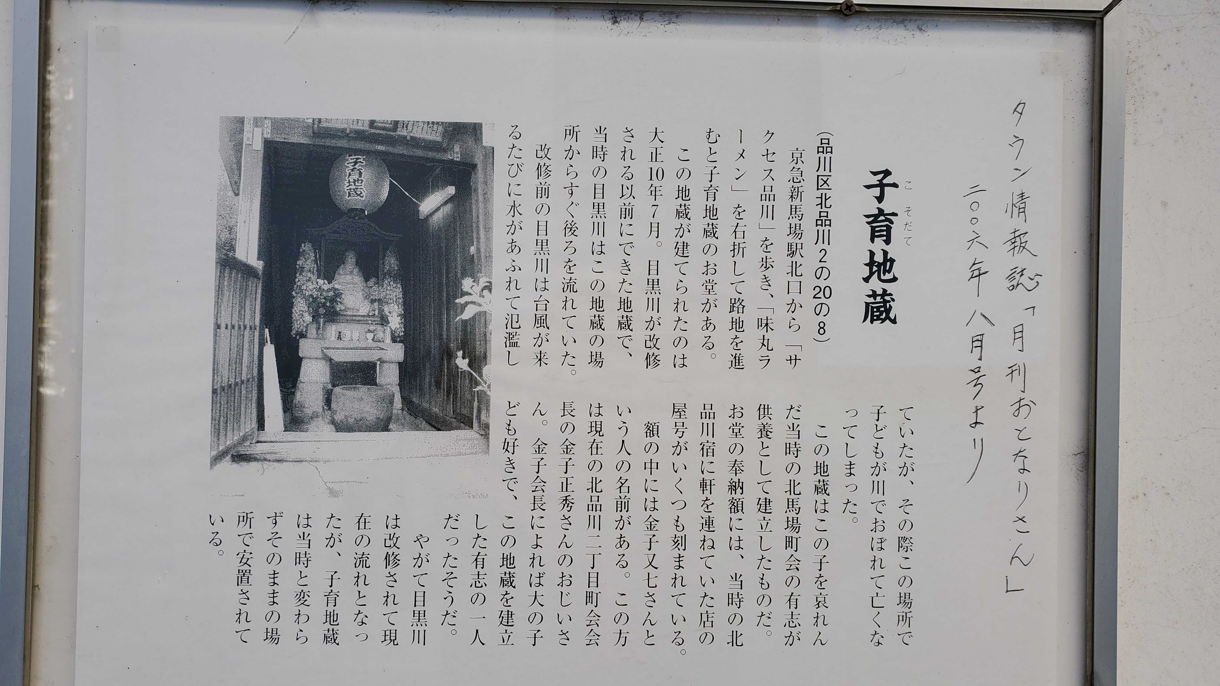 この地蔵のすぐ後ろを流れていた目黒川が氾濫し、川でおぼれて亡くなった子どもの供養にと、大正10年(1921年)7月に建立されました。100年前です。