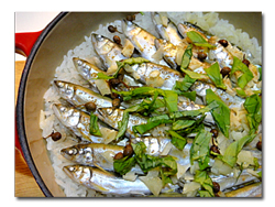 ルクルーゼのお鍋にお米を水ごと移し、さっと洗った稚鮎をお米の上に並べます。みじん切りのニンニク、山椒の実、塩をかけて強火で5分程度、シューシュー蒸気が出てきたら弱火で10分火にかけて炊き、15分間蒸らします。