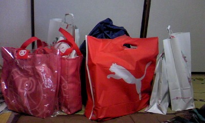 それで、毎年買っているハウスオブローゼの福袋を2つ、そして靴下の福袋を2つ買いました。すでに両手は大きな袋でちぎれそうな状態です。しかし、プーマの所で靴が30%オフという文字を見つけ、物色して、私のと息子のを買いました。
