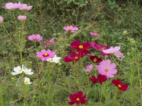 明石・江井ヶ島のコスモスです。田んぼに赤米の稲を植えて「9の字」描いている「9条田んぼ」があると聞いて、探してみました。それらしき田んぼがあったので、近くで刈取りをしている農家の人に聞いてみても「知らない」ということでした。しかし、すぐ近くの休耕田に咲いていたコスモスがきれいでした。