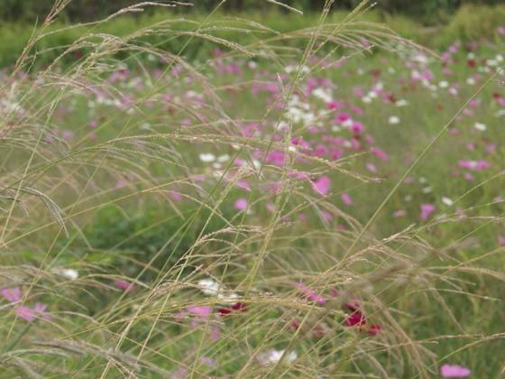 すすきがたなびき、コスモスをバックに・・・