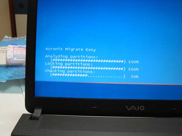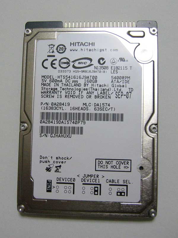 今使っているノートパソコン、SONYのVGN-FS52B、ハードディスクを大容量の物に差し替える!!HDDのリカバリ領域も削除して、めいっぱい使っているが、仮想CDのデータ格納領域、テレビ映像をチャプタしたデータの格納領域、デジカメ(一眼レフを買った)データの格納領域がどんどん増えてきて、足りなくなってきた。★そこで、現在の100GBから160GBへグレードアップを試みることにした。★◆使ったものは、以下のものだけ◆(1)新しいHDD本体:HITACHIのTravelstar 5K160(2)HDD外付けケース:玄人志向 GW2.5AI-U2(3)HDDデータ移行プログラム:Acronis MigrateEasy7.0(マイグレートと読む)ネットショップで仕入れた新しいHDDです。職場のノートPCのHDDを80GBから120GBにした経験があったので、作業には自信があった。ただ、ひとつ心配事は・・・。HDDをPCが認識するのには、その容量にいくつもの壁があって、64GBの壁、137GBの壁というものがあるのだ。IDE ディスク容量の壁について137Gbytes超IDEディスクの正しい使い方しかし、心配は無用だった。HDD外付けケースでつないでみると、149GBと認識してくれていた。160GBとならないのは、Windowsでは1K(キロ)バイト=1024バイトと処理するため。1M(メガ)=1Kバイト×1Kバイト=1024バイト×1024バイト1G(ギガ)=1M×1Kバイト=1024×1024×1024となる。つまり、HDDの容量が160GBの場合、160/(1024×1024×1024)=149GBと認識されるわけ。次回から、実際の作業に入ります。
