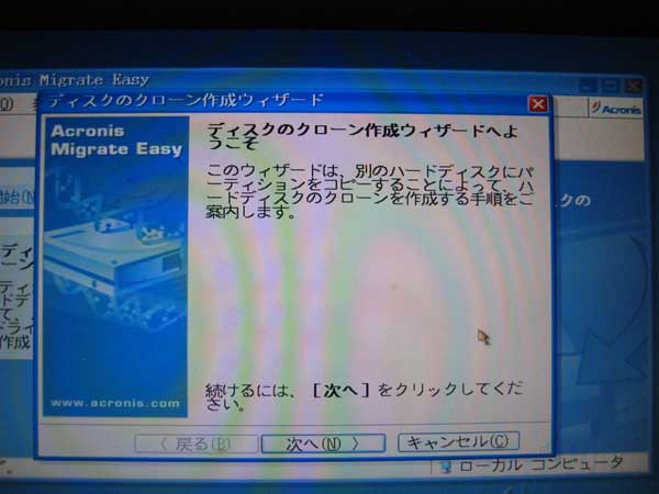PCを再起動後、元のHDDから新しいHDDへの移行作業が始まった時のようすです。最初に、元のHDDのエラーチェックが行われます。一番目のパーティションのデータ移行が行われています。下に、全体の進行状況と、このパーティションの進行状況が表示されます。2つ目のパーティションのデータ移行が行われます。データ移行作業が終わりました。何かキーを押すと作業が終了します。データ移行中の外付けHDDはランプが点滅。どんどん、データが書き込まれています。約80GBのデータで、2時間30分かかりました。かなり短いと思います。★★★