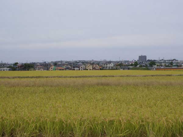 江井ヶ島の稲 真ん中に、色の違っているところがあります。