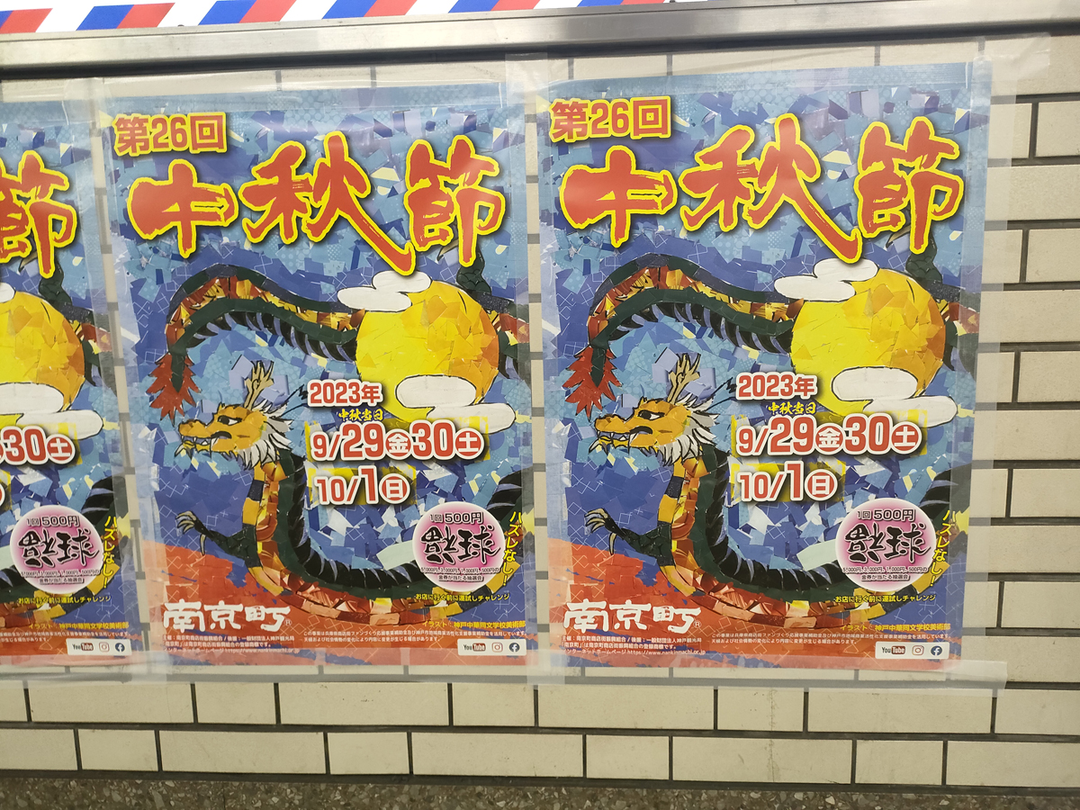 阪神元町駅西口のキップ売り場の横に中秋節のポスターがずらり…
