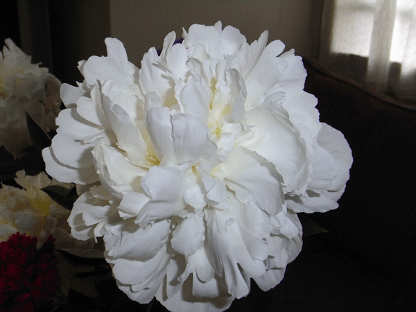 いつも山菜やきのこなど食べ物の話題ばかりなので、今回は美しさを愛でてみました。仏壇のお花を買う時に目に付いた「芍薬」の花。ツヤツヤした葉っぱの先に真っ白いボールが付いているような形。その時、写真を撮っておけばよかった・・・。三本で380円。「あっ、安いかも」と買ってきました。咲き始めると、部屋にかすかに甘い香りが漂い始めました。そして、ほどけるように咲いていく花びらの数の多い事。両手を広げたほどの大きさになった花を見ていると、どうしても気になります。一体何枚の花びらがついているのかしら・・・と。どうしても気になることは確認せねばと、数えてみました。ハハハハ・・・・暇人です、私。大きな花なので、さぞ大きな花びらが多いと思いきや、ご覧のように小さな花びらの方が多かったのです。一枚の大きな花びらが10数枚の小さな花びらを抱いて、それが寄せ集まってボリューム感あふれる一つの花になっていました。もう一つ気づいた事。香りは雌しべやおしべから発散されるものが多いように思いますが、この芍薬に関しては、花びら自体香りがしました。雌しべやおしべはどこ?・・・と探しながら数えましたが、たまに針の先のような物があるだけで、それがどっちなのか分かりませんでした。(写真の右下にあります。)で、花びらの枚数は、341枚。これで、恋占いすると時間がかかるだろうな~~でも、その間は「夢見る乙女心」に浸れるので、それもいいかも・・・・。暇人通信でした。