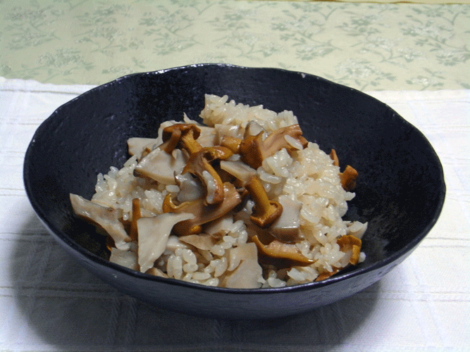 悩みと言うほどではないけど、秋になると考えてしまう事がある。「今年は松茸が採れるかしら・・・」と。以前も書いたような気がするけど・・子供の頃から見ていた夢。松茸を求めて山を彷徨うけど、見つかったものは形は松茸だけど香りのしない別のきのこ。なぜ、こんな夢を見始めたのか?なぜ、きのこ採りの文化がない南九州で育って、こうも天然きのこが好きなのか?これは、たぶん一生考えても分からないかも・・・。さて最初に戻って・・・きのこ採りを始めて2年目から松茸が採れ始めて、喜んでくれる方々にお裾分けしてきた。皆喜んでくれて、庭に生った柿が頂けたり、好物のチョコレートが届いたりする。私も、「いいんですよ・・・気を使わないでください」と言いつつ、これらの物を美味しく頂いている。とういわけで、秋になると待っている人々がいる・・・のです。採れたものを差し上げるのはこちらも喜びを感じるのでいいのですが、待っている人がいるのに採れなかったらどうしよう・・と、毎年プレッシャーがかかる訳です。それが、今年は先日思いの他収穫があったので、今ほっとしています。それぞれの方にお分けした後の、残りの松茸で「混ぜ込みご飯」を拵えました。いつもはケチケチ松茸ご飯ですが、今回は、エイヤァ!と思い切って、具沢山にしました。他の材料は無しの混ぜ込みご飯。炊き込んでしまうより香りと歯ざわりが逃げないので、こちらの方が美味しいように感じます。簡単ですし・・・。きのこ採りは、私にとって最上の喜びを伴う遊び。収穫は少なくても、探し歩きそして少しでも見つける事ができた時は嬉しいもの。これは食べ物を探し歩いていた先祖の記憶が強く私に残っているからなのか?やっぱり、どこまで考えても分からない問題です。。。