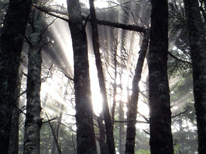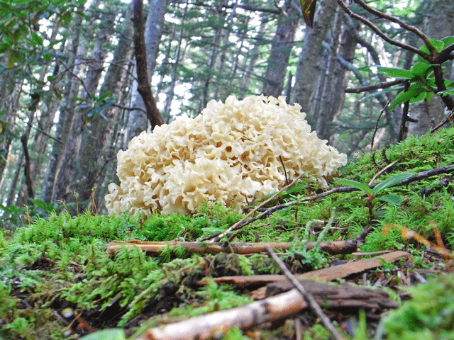 「森の夜明け」ほんのりとした光の下、夜明け前から森を歩いている私の周りに漂っていたうすい紫色の空気は、今日最初の光を受けて、その色を白く変えていく。梢の隙間から漏れて差し込む生まれたばかりの光には、目には見えないけれど天使が舞っている姿がぼんやり浮かんでいるような気がして、目を凝らして暫く見つめてしまう。ふと気づいた時は、風が木々を揺らし、遠くを走る車の音が細かい水分を沢山含んだ霧の中を伝わってくる。いつの間にか小鳥のさえずりも聞こえていて、私の足は愛しいきのこに出会うために再び大地を踏みしめて一歩を踏み出していく。 「マスタケ」夜が明けたように私も覚醒して、山の空気を吸い込みます。雨が降り続いて、幹までしっとりと濡れた立ち枯れの木に果樹のように生っている、目を瞠るような姿のきのこ。「マスタケ」の色の美しさは質感の柔らかさと相まって、優しい美しさです。以前バラの花のように広がった固体に出会ったことがありますが、こちらのマスタケもそれに劣らず吊り重なって重量感たっぷり・・・・。こんな光景を見ることが出来る散策は、私を虜にして、また深い森の中へと誘い込みます。私・・・・生まれ変わる前は森に棲む妖精だったかしら・・・??