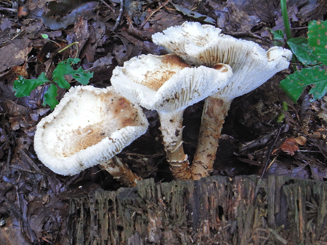 夏きのこもいよいよ終盤になるので、どうしても食べたいチタケを探しに昨日里山を歩いてきました。茄子炒めを作る度に、「ここにチタケが入っていたらなぁ~」と思ってしまうのは、ブログきのこ仲間の皆さんが、見事なチタケを採っているからです。せめて3本ぐらいは・・・と出かけた里山は車で20分ほどの場所。夜中まで雨が降っていた山の中は、濡れた木々の緑がつややかで美しいのですが、蒸し風呂のような暑さで、汗で服が肌に張り付く感じです。 「マツオウジ」最初に見つけたのは、この老菌のマツオウジ。分かりやすい場所に出ていたのですが、よくぞ採られることが無く次の代に命を繋いだものです。ヘビに出会った相方はビビってしまい、「やっぱり杖がないと・・・」と車まで杖を取りに行きました。アワタケの仲間、ムラサキヤマドリタケなどの老菌がそこら中にありましたので、きのこにとっては環境がいい場所のようです。でも、目当てのチタケは無しで、飛んでいるカブトムシを見つけただけ・・・。場所を変えることにしました。次の場所も条件は同じで蒸し暑いこと。2年ほど前はきのこにとって環境が良かったのですが、現在は林床を小笹が覆い、風が通らなくなっていました。これではチタケは望めそうにないので、山道脇に出ているきのこの写真を撮っていくことにしました。 「キツネノハナガサ」どんな職人さんがプリーツをとったの???というような儚げな美しさのきのこ、「キツネノハナガサ」は、このままの美しさを薄絹に写し取り帽子やドレスの飾りに使いたくなるほどです。 「マントカラカサタケ」蝉しぐれを聞きながら、お腹を空かしながら歩いていると、これ又えもいわれぬ姿のきのこが・・・。フワフワと綿毛を纏ったように立っている姿は、背の高さからいって(45センチほど)日よけの洋傘のようで、近くに白い夏ドレスを着た貴婦人がいるのではと思ってしまいました。「マントカラカサタケ」にも初めて出会いました。じっくりとカサを見ていると、出てくるのは「美味しそう・・」という言葉だけ・・。お腹が空いているので、風情もなにもあったものではありません。結局ここでもチタケは収穫なし・・というか、今回は他の収穫もありませんでした。キクラゲは数箇所で見つけましたが、夏のキクラゲは虫入りが多いので見るだけです。それでも、山を散策できたし、初めてのきのこにも出会えたので満足度70パーセント程。車に戻ってから、きのこご飯のおにぎりを食べて、車の下にもぐりこんでいた野良猫に挨拶して昨日の散策は終了しました。私が育った鹿児島は、栽培物の椎茸はよく使われていますが、天然きのこの食文化はありません。今はこうして美味しく頂いていますが、子供の頃はきのこの形の不思議さに惹かれて眺めるだけでしたので、私のきのこ好きは食べるというより形の美しさを愛でるのが先でした。何とかこの美しさを保存できないものかと、今日もマントカラカサタケの写真を眺めていました。